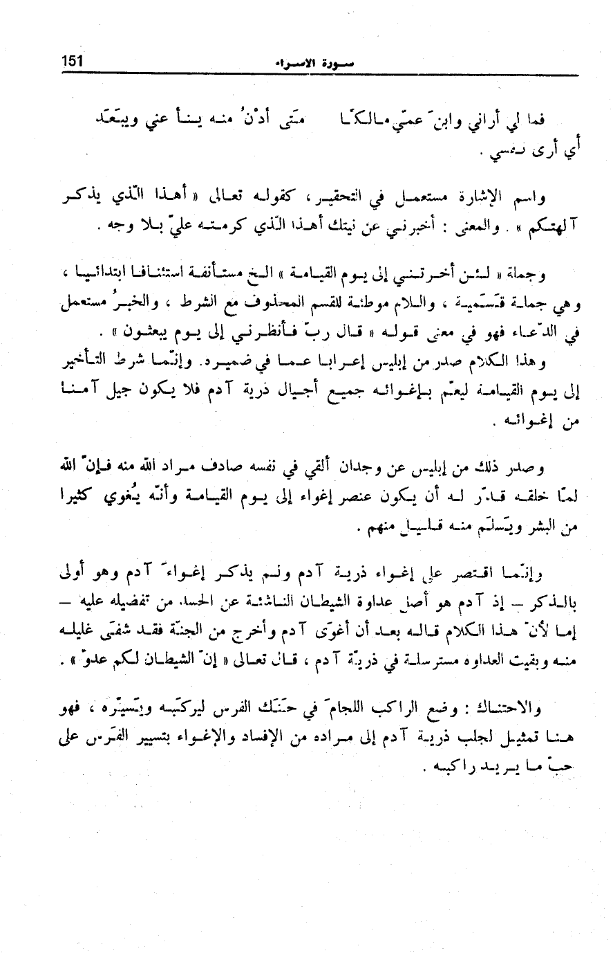 وَهَذَا الْكَلَامُ صَدَرَ مِنْ إِبْلِيسَ إِعْرَابًا عَمَّا فِي ضَمِيرِهِ وَإِنَّمَا شَرَطَ التَّأْخِيرَ إِلَى يَوْمِ الْقِيَامَةِ لِيَعُمَّ بِإِغْوَائِهِ جَمِيعَ أَجْيَالِ ذُرِّيَّةِ آدَمَ فَلَا يَكُونُ جِيلٌ آمِنًا مِنْ إِغْوَائِهِ.