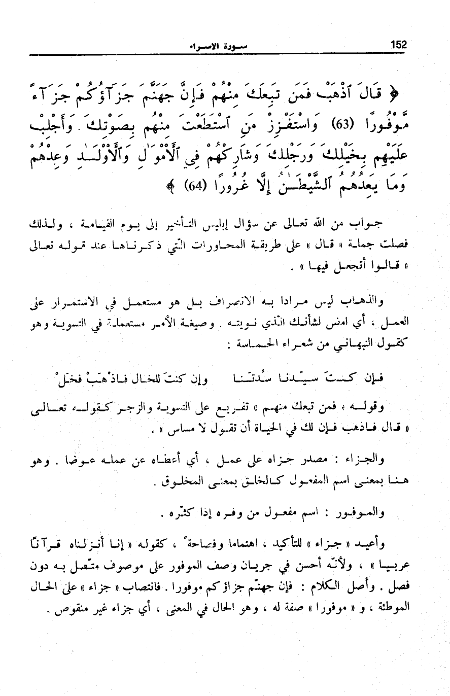 قالَ اذْهَبْ فَمَنْ تَبِعَكَ مِنْهُمْ فَإِنَّ جَهَنَّمَ جَزاؤُكُمْ جَزاءً مَوْفُوراً (63) وَاسْتَفْزِزْ مَنِ اسْتَطَعْتَ مِنْهُمْ بِصَوْتِكَ وَأَجْلِبْ عَلَيْهِمْ بِخَيْلِكَ وَرَجِلِكَ وَشارِكْهُمْ فِي الْأَمْوالِ وَالْأَوْلادِ وَعِدْهُمْ وَما يَعِدُهُمُ الشَّيْطانُ إِلاَّ غُرُوراً (64)