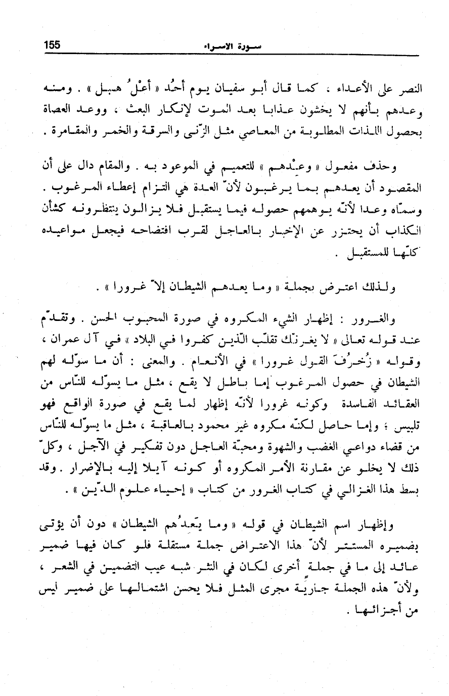 وَإِظْهَارُ اسْمِ الشَّيْطَانِ فِي قَوْلِهِ: وَما يَعِدُهُمُ الشَّيْطانُ دون أَن يُؤْتى بِضَمِيرِهِ الْمُسْتَتِرِ لِأَنَّ هَذَا الِاعْتِرَاضَ جُمْلَةٌ مُسْتَقِلَّةٌ فَلَوْ كَانَ فِيهَا ضَمِيرٌ عَائِدٌ إِلَى مَا فِي جُمْلَةٍ أُخْرَى لَكَانَ فِي النَّثْرِ شِبْهُ عَيْبِ التَّضْمِينِ فِي الشِّعْرِ، وَلِأَنَّ هَذِهِ الْجُمْلَةَ جَارِيَةٌ مَجْرَى الْمَثَلِ فَلَا يَحْسُنُ اشْتِمَالُهَا عَلَى ضَمِيرٍ لَيْسَ من أَجْزَائِهَا.
