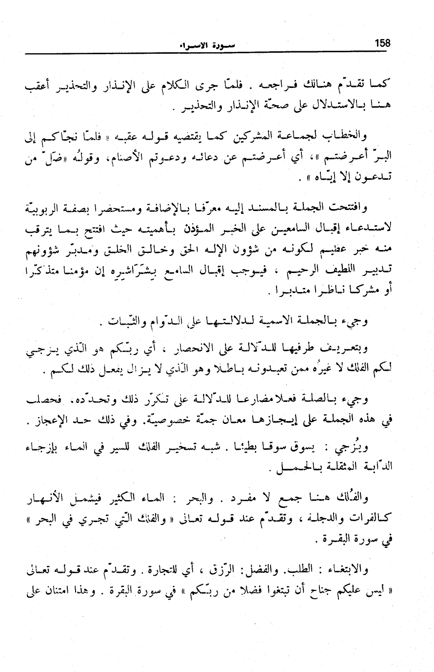 وَبِتَعْرِيفِ طَرَفَيْهَا لِلدَّلَالَةِ عَلَى الِانْحِصَارِ، أَيْ رَبُّكُمْ هُوَ الَّذِي يُزْجِي لَكُمُ الْفُلْكَ لَا غَيْرُهُ مِمَّنْ تَعْبُدُونَهُ بَاطِلًا وَهُوَ الَّذِي لَا يَزَالُ يَفْعَلُ ذَلِكَ لَكُمْ.