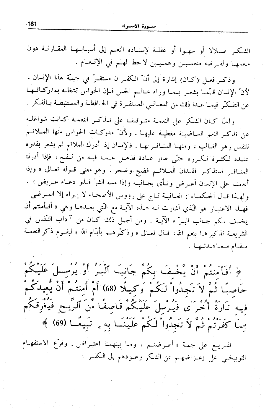 وَلَمَّا كَانَ الشُّكْرُ عَلَى النِّعْمَةِ مُتَوَقِّفًا عَلَى تَذَكُّرِ النِّعْمَةِ كَانَتْ شَوَاغِلُهُ عَنْ تَذَكُّرِ النِّعَمِ الْمَاضِيَةِ مُغَطِّيَةً عَلَيْهَا، وَلِأَنَّ مُدْرَكَاتِ الْحَوَاسِّ مِنْهَا الْمُلَائِمُ لِلنَّفْسِ وَهُوَ الْغَالِبُ، وَمِنْهَا الْمُنَافِرُ لَهَا. فَالْإِنْسَانُ إِذَا أَدْرَكَ الْمُلَائِمَ لَمْ يَشْعُرْ بِقُدْرَةٍ عِنْدَهُ لِكَثْرَةِ تَكَرُّرِهِ حَتَّى صَارَ عَادَةً فَذُهِلَ عَمَّا فِيهِ مِنْ نَفْعٍ، فَإِذَا أَدْرَكَ الْمُنَافِرَ اسْتَذْكَرَ فُقْدَانَ الْمُلَائِمِ فَضَجَّ وَضَجِرَ. وَهُوَ مَعْنَى قَوْلِهِ تَعَالَى: وَإِذا أَنْعَمْنا عَلَى الْإِنْسانِ أَعْرَضَ وَنَأى بِجانِبِهِ وَإِذا مَسَّهُ الشَّرُّ فَذُو دُعاءٍ عَرِيضٍ [فصلت: 51] . وَلِهَذَا قَالَ الْحُكَمَاءُ: الْعَافِيَةُ تَاج على رُؤُوس الْأَصِحَّاءِ لَا يَرَاهُ إِلَّا الْمَرْضَى فَهَذَا الِاعْتِبَارُ هُوَ الَّذِي أَشَارَتْ لَهُ هَذِهِ الْآيَةُ مَعَ الَّتِي بَعْدَهَا وَهِيَ أَفَأَمِنْتُمْ أَنْ يَخْسِفَ بِكُمْ جانِبَ الْبَرِّ [الْإِسْرَاء: 68] الْآيَةَ. وَمِنْ أَجْلِ ذَلِكَ كَانَ مِنْ آدَابِ النَّفْسِ فِي الشَّرِيعَةِ تَذْكِيرُهَا بِنِعَمِ اللَّهِ، قَالَ تَعَالَى: وَذَكِّرْهُمْ بِأَيَّامِ اللَّهِ [إِبْرَاهِيم: 5] لِيَقُومَ ذِكْرُ النِّعْمَةِ مقَام معاهدتها.