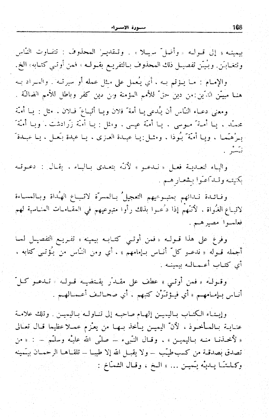 نَدْعُوا كُلَّ أُناسٍ بِإِمامِهِمْ، أَي وَمِنَ النَّاسِ مَنْ يُؤْتَى كِتَابَهُ، أَيْ كِتَابَ أَعْمَالِهِ بِيَمِينِهِ.