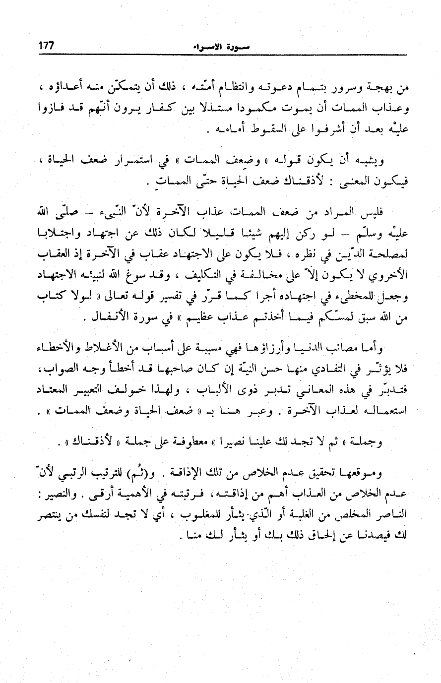 فَلَيْسَ الْمُرَادُ مِنْ ضِعْفِ الْمَمَاتِ عَذَابَ الْآخِرَةِ لِأَن النبيء صَلَّى اللهُ عَلَيْهِ وَسَلَّمَ لَوْ رَكَنَ إِلَيْهِمْ شَيْئًا قَلِيلًا لَكَانَ ذَلِكَ عَنِ اجْتِهَادٍ وَاجْتِلَابًا لِمَصْلَحَةِ الدِّينِ فِي نَظَرِهِ، فَلَا يَكُونُ عَلَى الِاجْتِهَادِ عِقَابٌ فِي الْآخِرَةِ إِذِ الْعِقَابُ الْأُخْرَوِيُّ لَا يَكُونُ إِلَّا عَلَى مُخَالَفَةٍ فِي التَّكْلِيفِ، وَقَدْ سوغ الله لنبيئه الِاجْتِهَاد وَجعل للمخطىء فِي اجْتِهَادِهِ أَجْرًا كَمَا قَرَّرَ فِي تَفْسِيرِ قَوْلِهِ تَعَالَى: لَوْلا كِتابٌ مِنَ اللَّهِ سَبَقَ لَمَسَّكُمْ فِيما أَخَذْتُمْ عَذابٌ عَظِيمٌ فِي سُورَةِ الْأَنْفَالِ [68] .