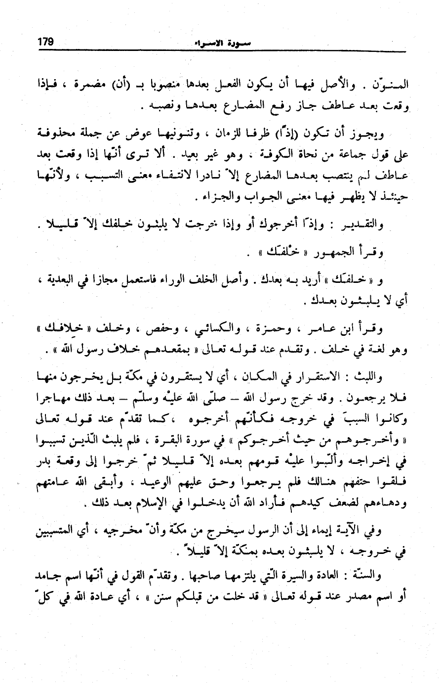 وَاللُّبْثُ: الِاسْتِقْرَارُ فِي الْمَكَانِ، أَيْ لَا يَسْتَقِرُّونَ فِي مَكَّةَ بَلْ يَخْرُجُونَ مِنْهَا فَلَا يَرْجِعُونَ. وَقَدْ خَرَجَ رَسُول الله صَلَّى اللهُ عَلَيْهِ وَسَلَّمَ بَعْدَ ذَلِكَ مُهَاجِرًا وَكَانُوا السَّبَبَ فِي خُرُوجِهِ فَكَأَنَّهُمْ أَخْرَجُوهُ، كَمَا تَقَدَّمَ عِنْدَ قَوْلِهِ تَعَالَى: وَأَخْرِجُوهُمْ مِنْ حَيْثُ أَخْرَجُوكُمْ فِي سُورَةِ الْبَقَرَةِ [191] ، فَلَمْ يَلْبَثِ الَّذِينَ تَسَبَّبُوا فِي إِخْرَاجِهِ وَأَلَّبُوا عَلَيْهِ قَوْمَهُمْ بَعْدَهُ إِلَّا قَلِيلًا ثُمَّ خَرَجُوا إِلَى وَقْعَةٍ بَدْرٍ فَلَقُوا حَتْفَهُمْ هُنَالِكَ فَلَمْ يَرْجِعُوا وَحَقَّ عَلَيْهِمُ الْوَعِيدُ، وَأَبْقَى الله عامتهم ودهاءهم لِضَعْفِ كَيْدِهِمْ فَأَرَادَ اللَّهُ أَنْ يَدْخُلُوا فِي الْإِسْلَامِ بَعْدَ ذَلِكَ.