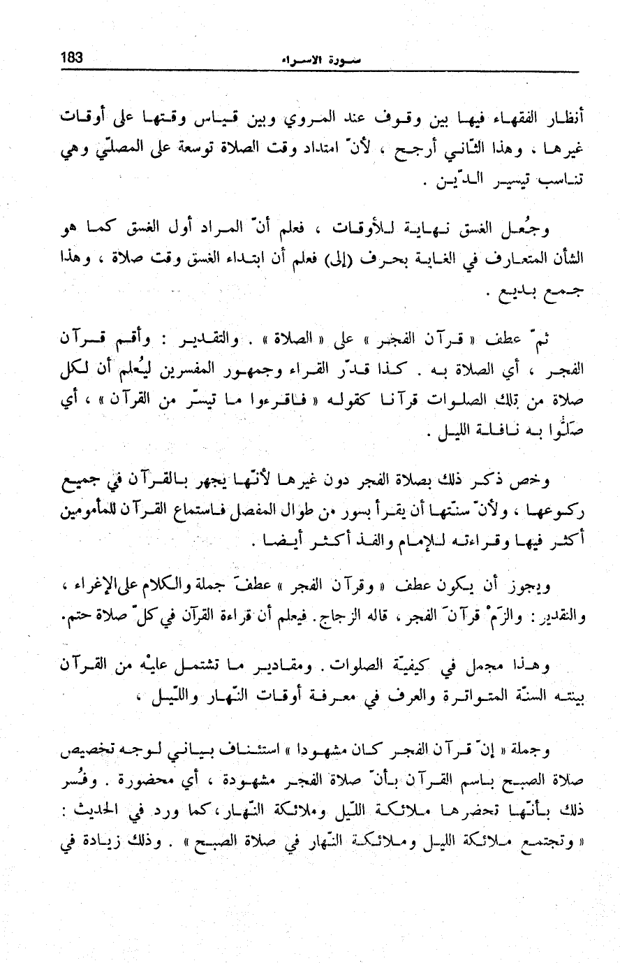 ثُمَّ عَطَفَ قُرْآنَ الْفَجْرِ عَلَى الصَّلاةَ. وَالتَّقْدِيرُ: وَأَقِمْ قُرْآنَ الْفَجْرِ، أَيِ الصَّلَاةَ بِهِ. كَذَا قَدَّرَ الْقُرَّاءُ وَجُمْهُورُ الْمُفَسِّرِينَ لِيُعْلَمَ أَنَّ لِكُلِّ صَلَاةٍ مِنْ تِلْكَ الصَّلَوَاتِ قُرْآنًا كَقَوْلِه: