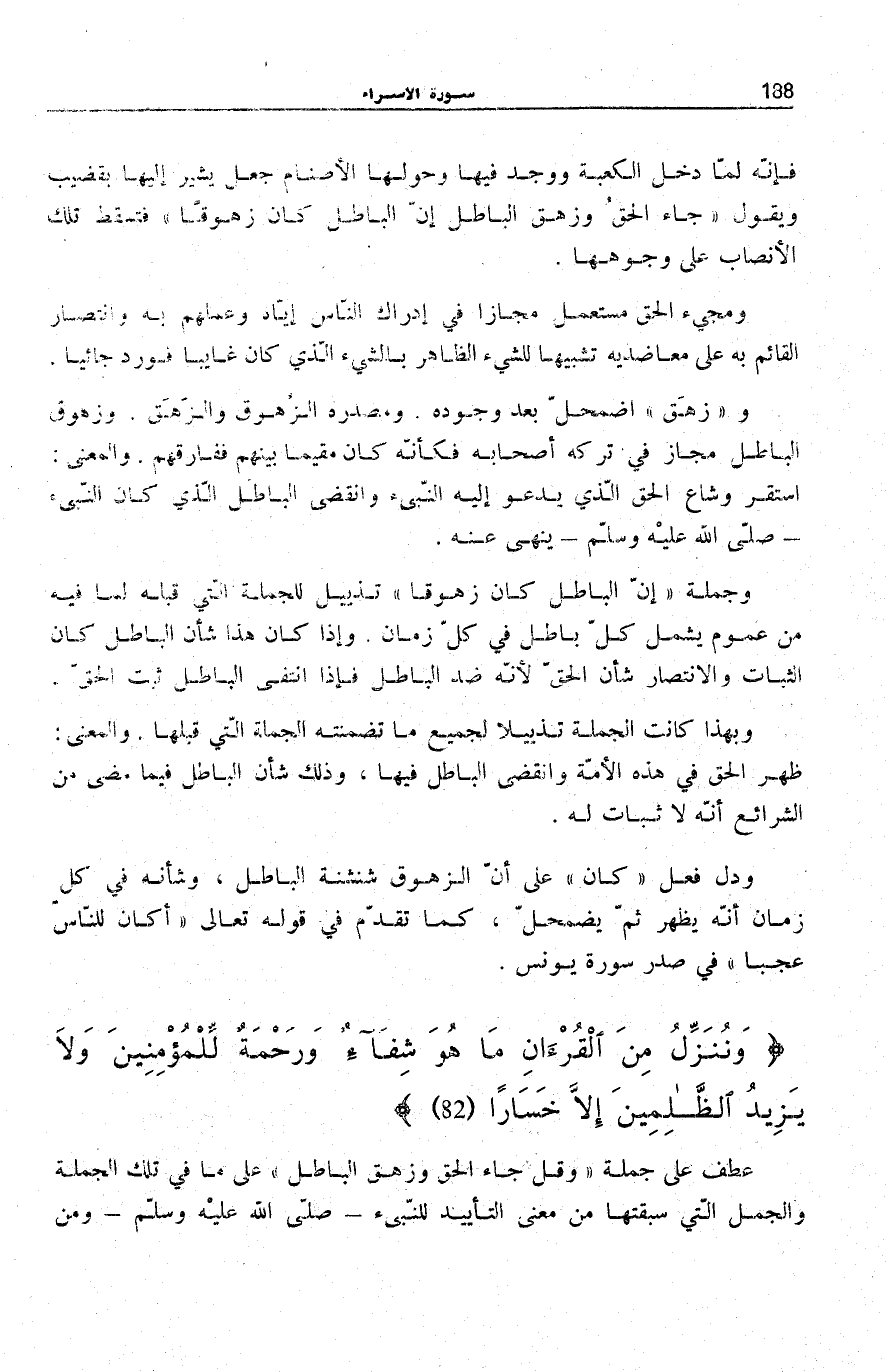 وَجُمْلَةُ إِنَّ الْباطِلَ كانَ زَهُوقاً تَذْيِيلٌ لِلْجُمْلَةِ الَّتِي قَبْلَهُ لِمَا فِيهِ مِنْ عُمُومٍ يَشْمَلُ كُلَّ بَاطِلٍ فِي كُلِّ زَمَانٍ. وَإِذَا كَانَ هَذَا شَأْنَ الْبَاطِلِ كَانَ الثَّبَاتُ وَالِانْتِصَارُ شَأْنَ الْحَقِّ لِأَنَّهُ ضِدُّ الْبَاطِلِ فَإِذَا انْتَفَى الْبَاطِلُ ثَبَتَ الْحَقُّ.