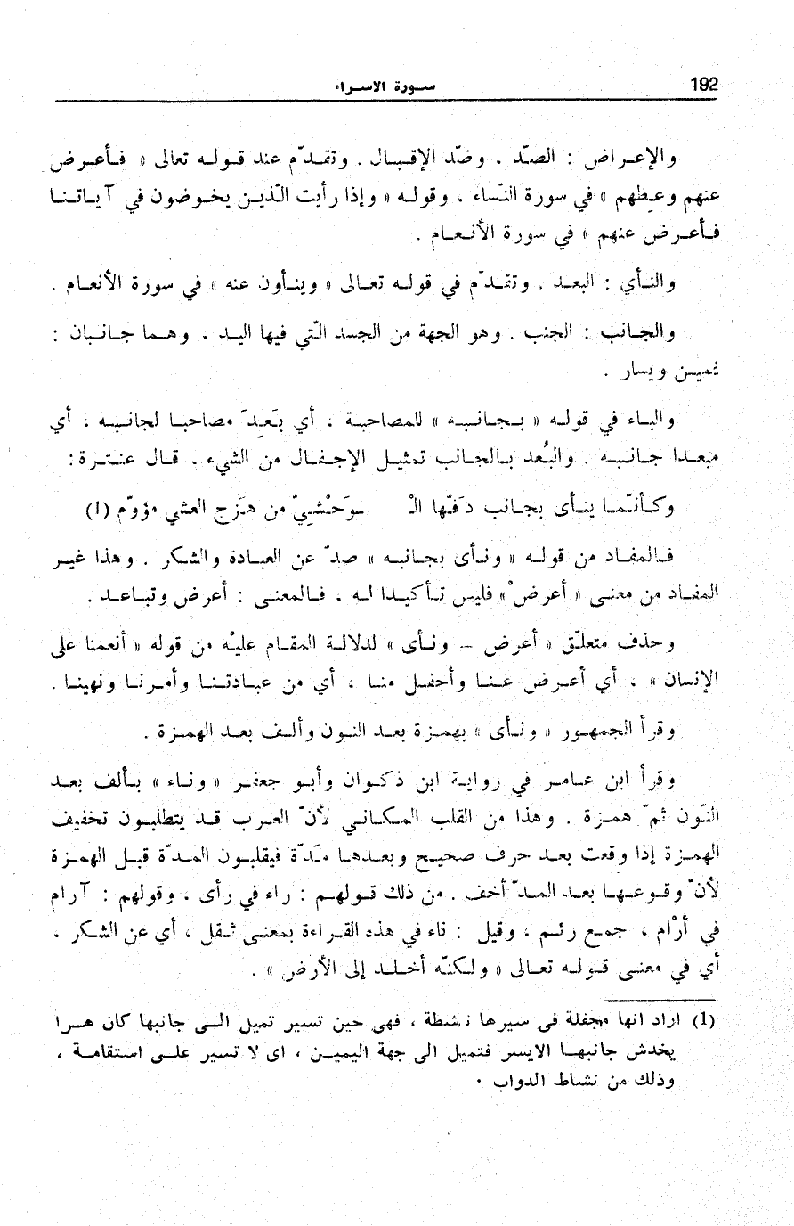 وَهَذَا مِنَ الْقَلْبِ الْمَكَانِيِّ لِأَنَّ الْعَرَبَ قَدْ يَتَطَلَّبُونَ تَخْفِيفَ الْهَمْزَةِ إِذَا وَقَعَتْ بَعْدَ حَرْفٍ صَحِيحٍ وَبَعْدَهَا مَدَّةٌ فَيَقْلِبُونَ الْمَدَّةَ قَبْلَ الْهَمْزَةِ لِأَنَّ وُقُوعَهَا بَعْدَ الْمَدِّ أَخَفُّ. مِنْ ذَلِكَ قَوْلُهُمْ: رَاءَ فِي رَأَى، وَقَوْلُهُمْ: آرَامٌ فِي أَرْآمٍ، جَمْعُ رِئْمٍ، وَقِيلَ: نَاءَ فِي هَذِهِ الْقِرَاءَةِ بِمَعْنَى ثَقُلَ، أَيْ عَنِ الشُّكْرِ، أَيْ فِي مَعْنَى قَوْلِهِ تَعَالَى: وَلكِنَّهُ أَخْلَدَ إِلَى الْأَرْضِ [الْأَعْرَاف: