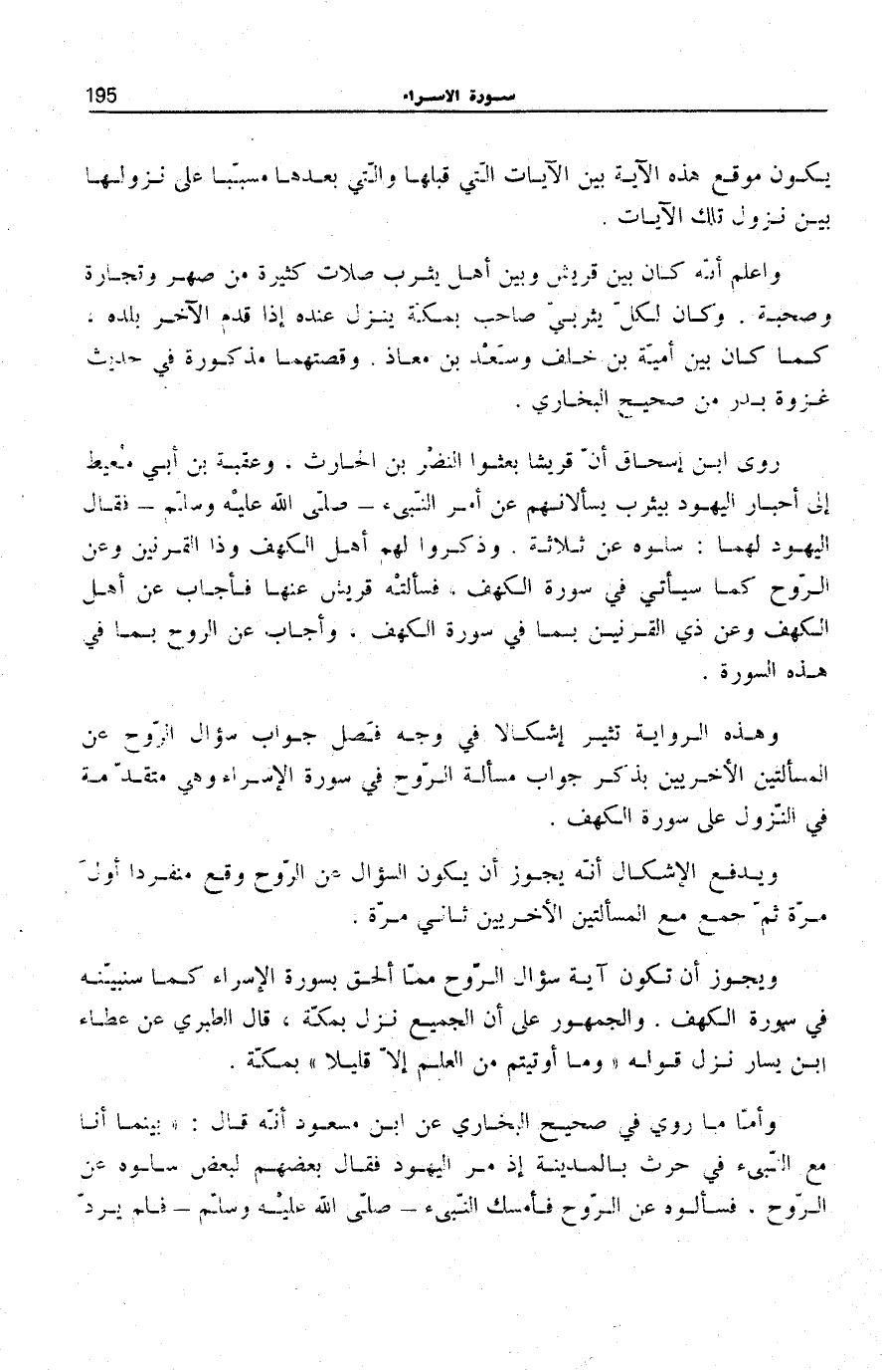 وَهَذِهِ الرِّوَايَةُ تُثِيرُ إِشْكَالًا فِي وَجْهِ فَصْلِ جَوَابِ سُؤَالِ الرُّوحِ عَنِ الْمَسْأَلَتَيْنِ الْأُخْرَيَيْنِ بِذِكْرِ جَوَابِ مَسْأَلَةِ الرُّوحِ فِي سُورَةِ الْإِسْرَاءِ وَهِيَ مُتَقَدِّمَةٌ فِي النُّزُولِ عَلَى سُورَةِ الْكَهْفِ.