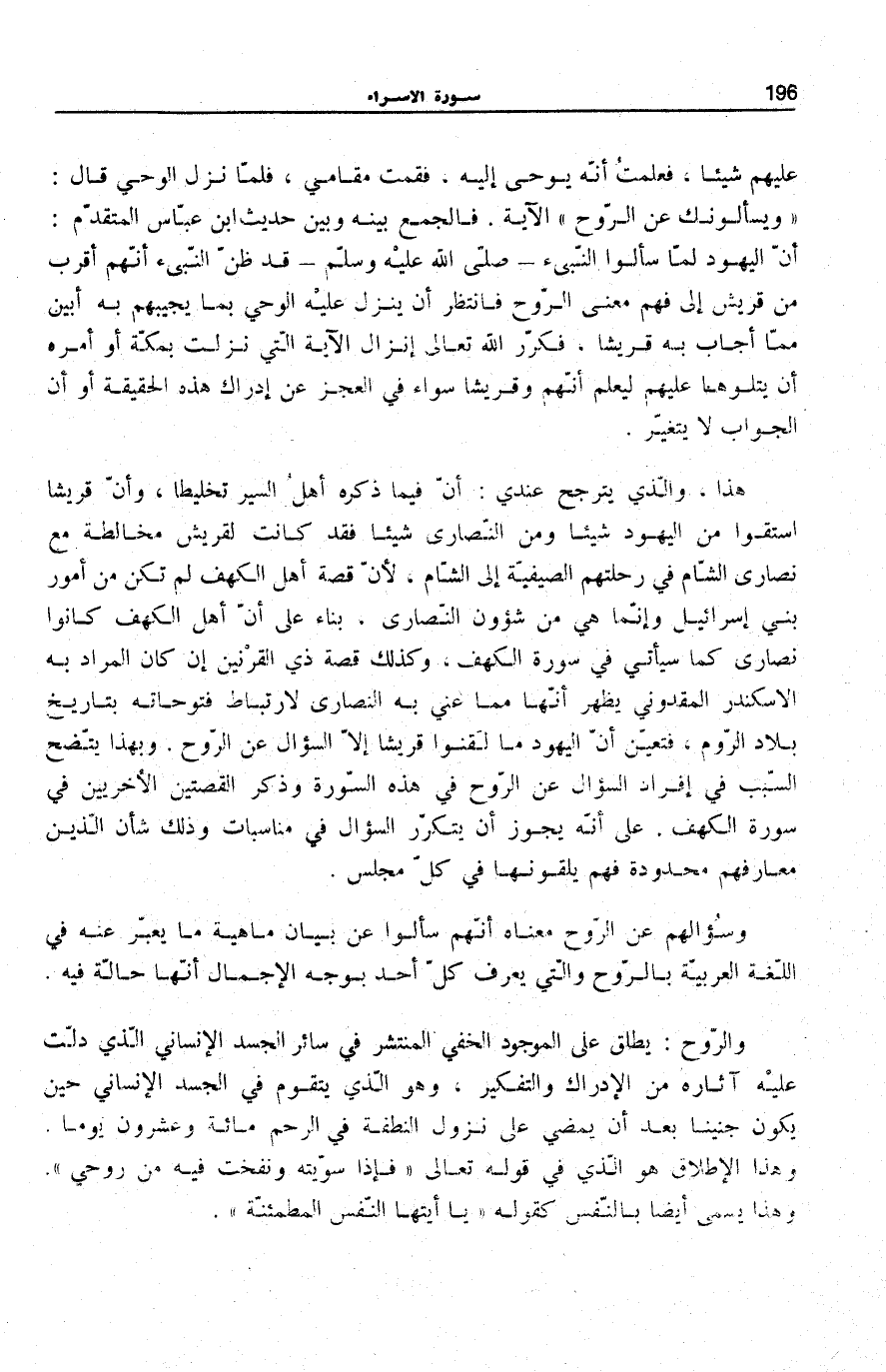 وَسُؤَالُهُمْ عَنِ الرُّوحِ مَعْنَاهُ أَنهم سَأَلُوا عَنْ بَيَانِ مَاهِيَّةِ مَا يُعَبَّرُ عَنْهُ فِي اللُّغَةِ الْعَرَبِيَّةِ بِالرُّوحِ وَالَّتِي يَعْرِفُ كُلُّ أَحَدٍ بِوَجْهِ الْإِجْمَالِ أَنَّهَا حَالَّةٌ فِيهِ.