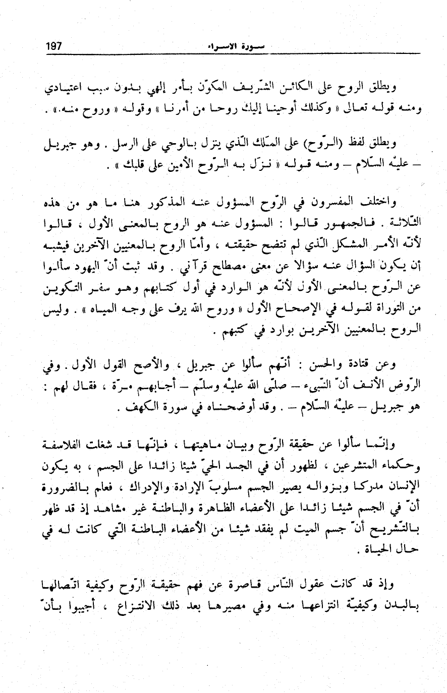 وَإِنَّمَا سَأَلُوا عَنْ حَقِيقَةِ الرُّوحِ وَبَيَانِ مَاهِيَّتِهَا، فَإِنَّهَا قَدْ شَغَلَتِ الْفَلَاسِفَةَ وَحُكَمَاءَ الْمُتَشَرِّعِينَ، لِظُهُورِ أَنَّ فِي الْجَسَدِ الْحَيِّ شَيْئًا زَائِدًا عَلَى الْجِسْمِ، بِهِ يَكُونُ الْإِنْسَانُ مُدْرِكًا وَبِزَوَالِهِ يَصِيرُ الْجِسْمُ مَسْلُوبَ الْإِرَادَةِ وَالْإِدْرَاكِ، فَعُلِمَ بِالضَّرُورَةِ أَنَّ فِي الْجِسْمِ شَيْئًا زَائِدًا عَلَى الْأَعْضَاءِ الظَّاهِرَةِ وَالْبَاطِنَةِ غَيْرَ مُشَاهَدٍ إِذْ قَدْ ظَهَرَ بِالتَّشْرِيحِ أَنَّ جِسْمَ الْمَيِّتِ لَمْ يَفْقِدْ شَيْئًا مِنَ الْأَعْضَاءِ الْبَاطِنَةِ الَّتِي كَانَتْ لَهُ فِي حَالِ الْحَيَاةِ.