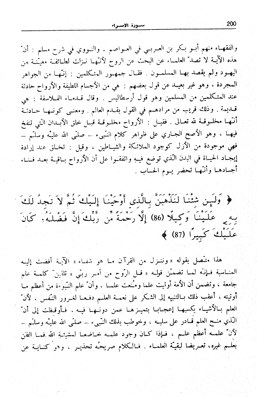 وَالْفُقَهَاءِ مِنْهُمْ أَبُو بَكْرِ بْنُ الْعَرَبِيِّ فِي «الْعَوَاصِمِ» ، وَالنَّوَوِيُّ فِي «شَرْحِ مُسْلِمٍ» : أَنَّ هَذِهِ الْآيَةَ لَا تَصُدُّ الْعُلَمَاءَ عَنِ الْبَحْثِ عَنِ الرُّوحِ لِأَنَّهَا نَزَلَتْ لِطَائِفَةٍ مُعَيَّنَةٍ مِنَ الْيَهُودِ وَلَمْ يُقْصَدْ بِهَا الْمُسْلِمُونَ. فَقَالَ جُمْهُورُ