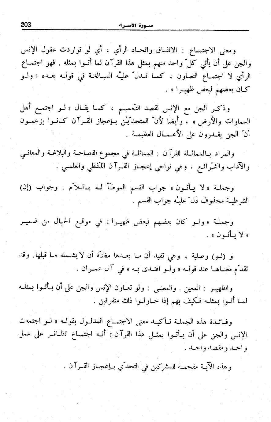 وَمَعْنَى الِاجْتِمَاعِ: الِاتِّفَاقُ وَاتِّحَادُ الرَّأْيِ، أَيْ لَوْ تَوَارَدَتْ عُقُولُ الْإِنْسِ وَالْجِنِّ عَلَى أَنْ يَأْتِيَ كُلُّ وَاحِدٍ مِنْهُمْ بِمِثْلِ هَذَا الْقُرْآنِ لَمَا أَتَوْا بِمِثْلِهِ. فَهُوَ اجْتِمَاعُ الرَّأْيِ لَا اجْتِمَاعُ التَّعَاوُنِ، كَمَا تَدُلُّ عَلَيْهِ الْمُبَالَغَةُ فِي قَوْلِهِ بَعْدَهُ: وَلَوْ كانَ بَعْضُهُمْ لِبَعْضٍ ظَهِيراً.