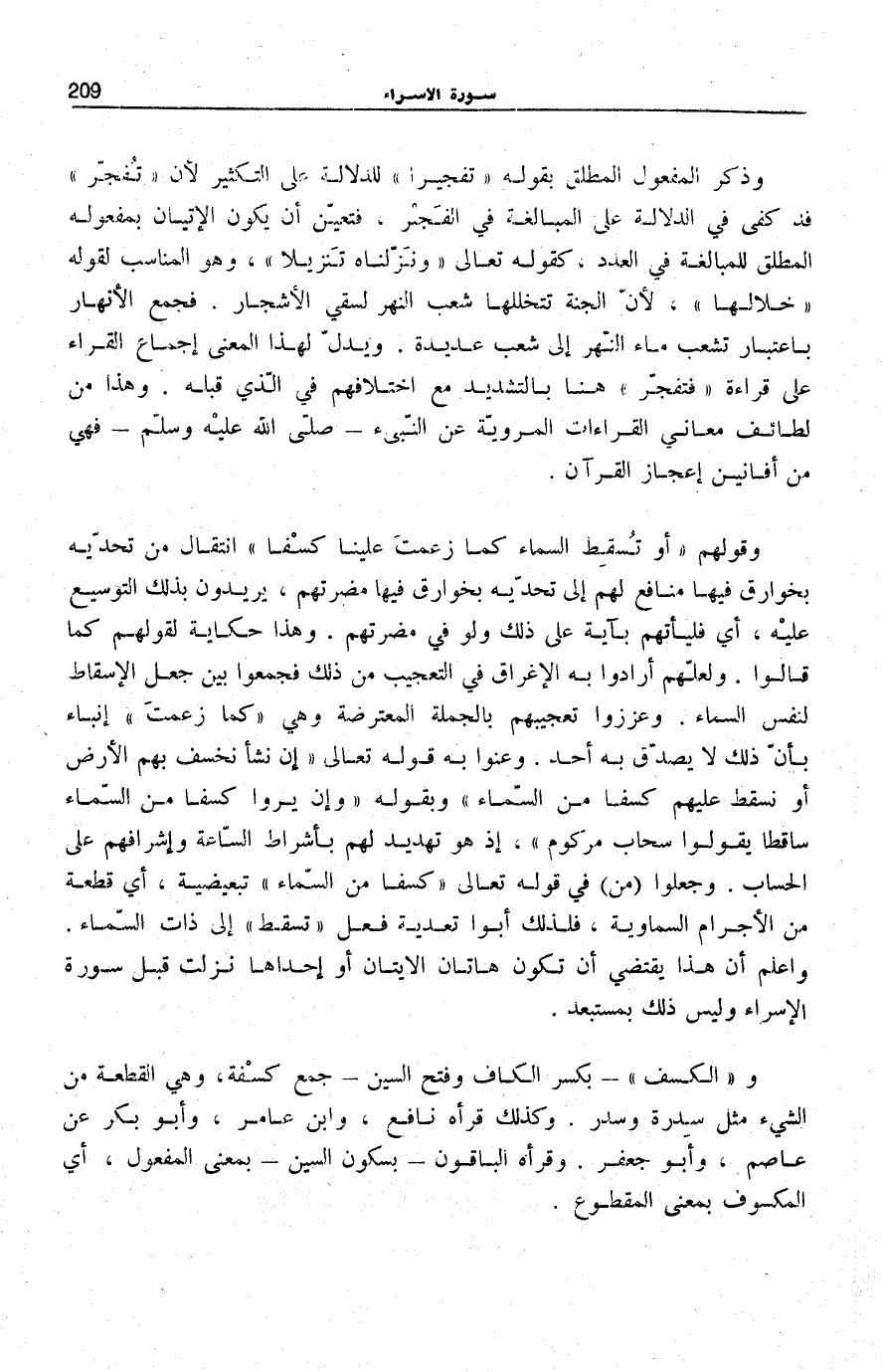 وَإِنْ يَرَوْا كِسْفاً مِنَ السَّماءِ ساقِطاً يَقُولُوا سَحابٌ مَرْكُومٌ [الطّور: 44] ، إِذْ هُوَ تَهْدِيدٌ لَهُمْ بِأَشْرَاطِ السَّاعَةِ وَإِشْرَافِهِمْ عَلَى الْحِسَابِ. وَجَعَلُوا (مِنْ) فِي قَوْلِهِ تَعَالَى: كِسَفاً مِنَ السَّماءِ [الطّور: 44] تَبْعِيضِيَّةً، أَيْ قِطْعَةً مِنَ الْأَجْرَامِ السَّمَاوِيَّةِ، فَلِذَلِكَ أَبَوْا تَعْدِيَةَ فِعْلِ تُسْقِطَ إِلَى ذَاتِ السَّمَاءِ. وَاعْلَمْ أَنَّ هَذَا يَقْتَضِي أَنْ تَكُونَ هَاتَانِ الْآيَتَانِ أَوْ إِحْدَاهَا نَزَلَتْ قَبْلَ سُورَةِ الْإِسْرَاءِ وَلَيْسَ ذَلِك بمستبعد.