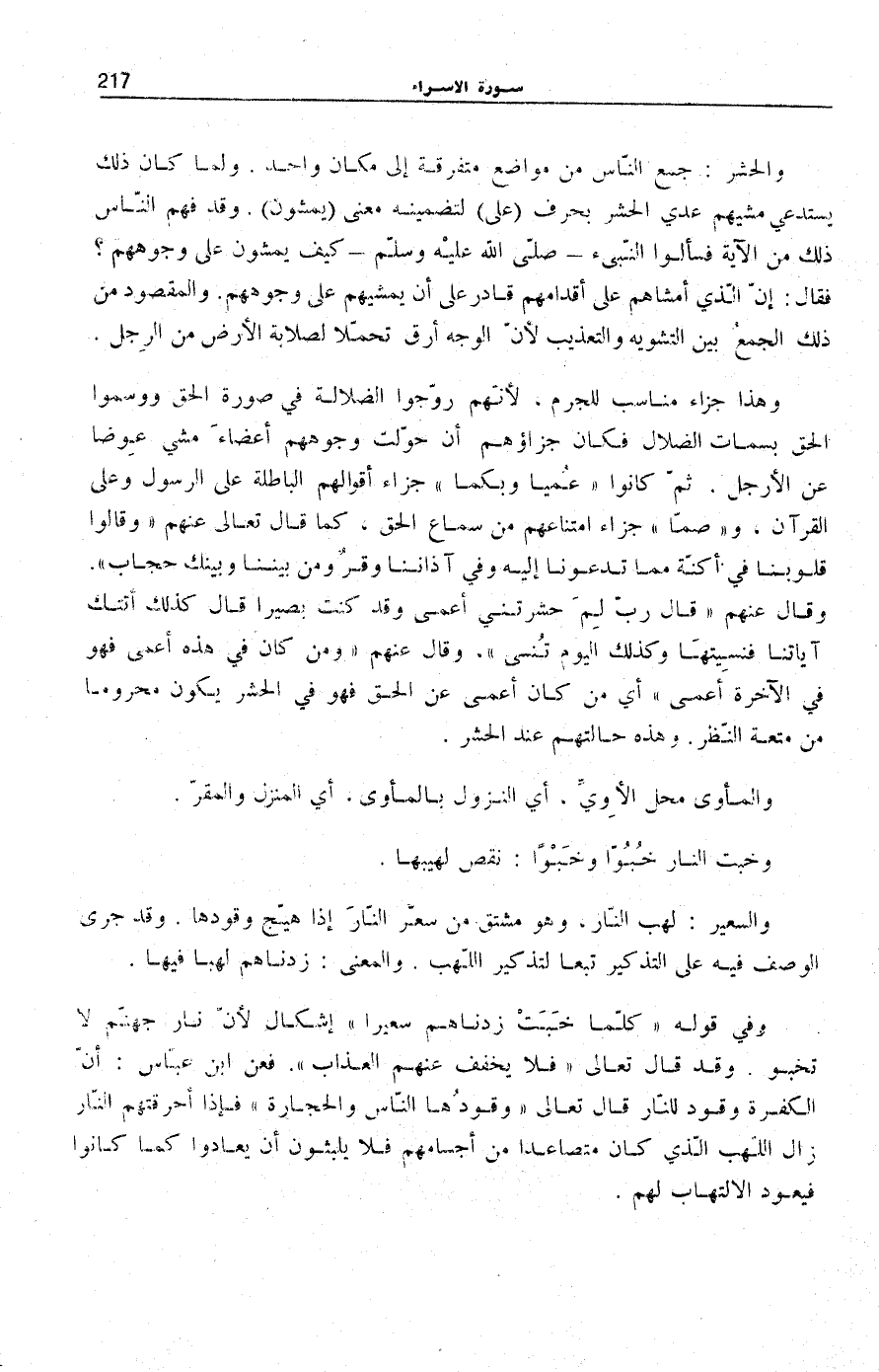 وَفِي قَوْلِهِ: كُلَّما خَبَتْ زِدْناهُمْ سَعِيراً إِشْكَالٌ لِأَنَّ نَارَ جَهَنَّمَ لَا تَخْبُو. وَقَدْ قَالَ تَعَالَى: فَلا يُخَفَّفُ عَنْهُمُ الْعَذابُ [الْبَقَرَة: 86] . فَعَنِ ابْنِ عَبَّاسٍ: أَنَّ الْكَفَرَةَ وَقُودٌ لِلنَّارِ قَالَ تَعَالَى: وَقُودُهَا النَّاسُ وَالْحِجارَةُ [الْبَقَرَة: 24] فَإِذَا أَحْرَقَتْهُمُ النَّارُ زَالَ اللَّهَبُ الَّذِي كَانَ مُتَصَاعِدًا مِنْ أَجْسَامِهِمْ فَلَا يَلْبَثُونَ أَنْ يُعَادَوْا كَمَا كَانُوا فَيَعُودَ الِالْتِهَابُ لَهُمْ.