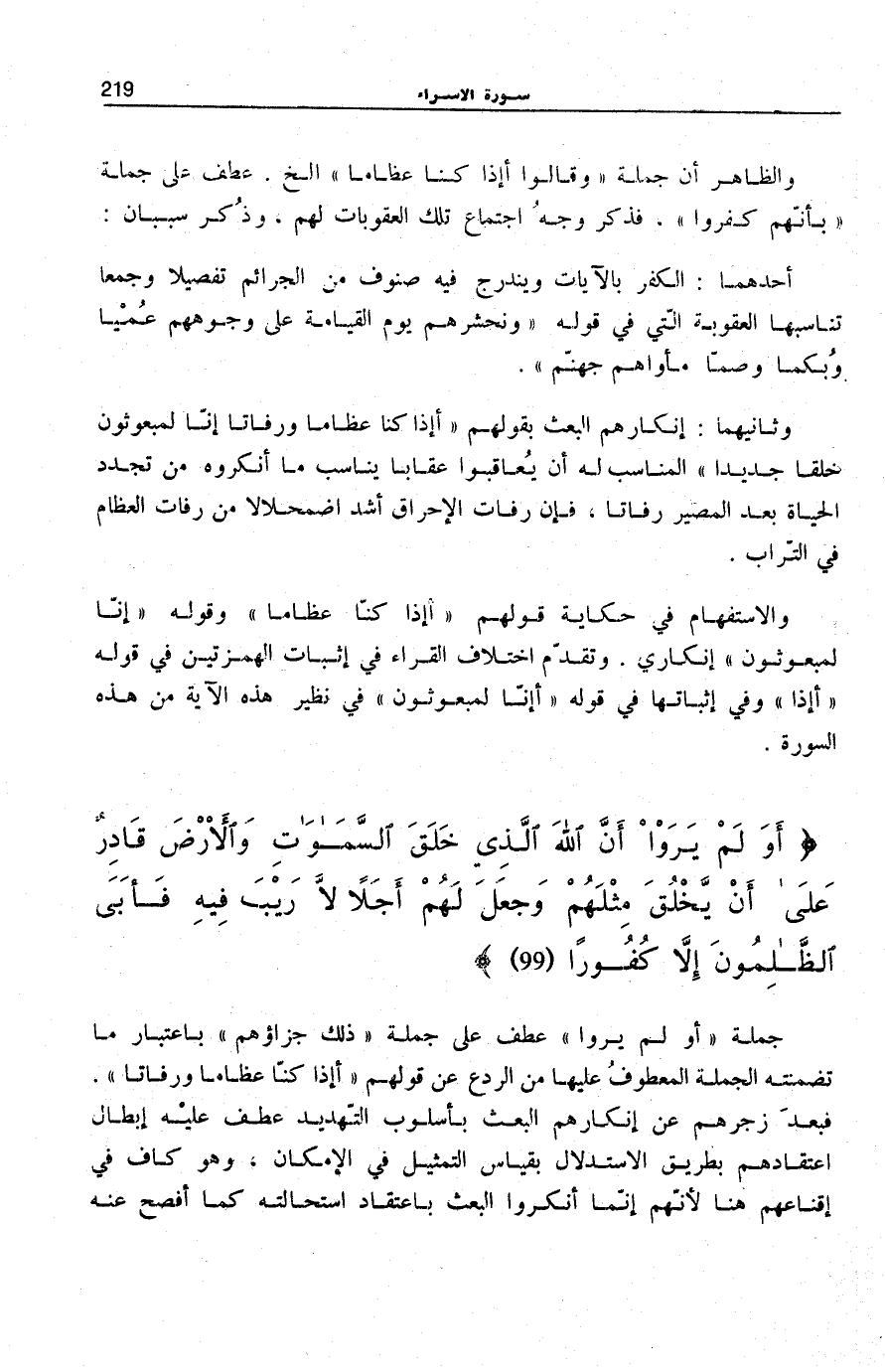 98] . فَبَعْدَ زَجْرِهِمْ عَنْ إِنْكَارِهِمُ الْبَعْثَ بِأُسْلُوبِ التَّهْدِيدِ عَطَفَ عَلَيْهِ إِبْطَالَ اعْتِقَادِهِمْ بِطَرِيقِ الِاسْتِدْلَالِ بِقِيَاسِ التَّمْثِيلِ فِي الْإِمْكَانِ، وَهُوَ كَافٍ فِي إِقْنَاعِهِمْ هُنَا لِأَنَّهُمْ إِنَّمَا أَنْكَرُوا الْبَعْثَ بِاعْتِقَادِ اسْتِحَالَتِهِ كَمَا أَفْصَحَ عَنْهُ