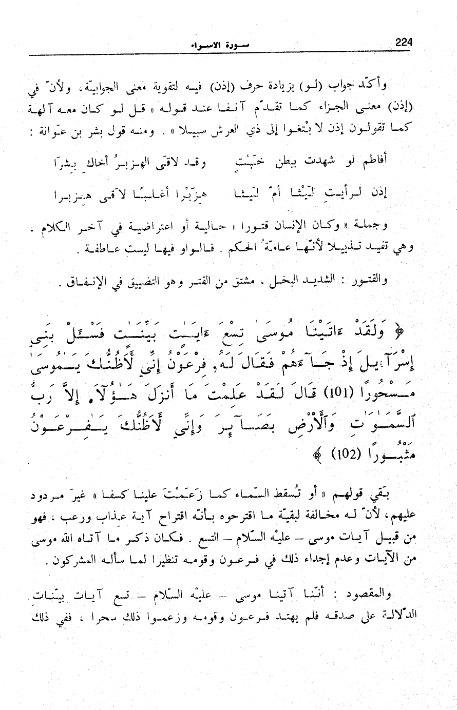 وَلَقَدْ آتَيْنا مُوسى تِسْعَ آياتٍ بَيِّناتٍ فَسْئَلْ بَنِي إِسْرائِيلَ إِذْ جاءَهُمْ فَقالَ لَهُ فِرْعَوْنُ إِنِّي لَأَظُنُّكَ يَا مُوسى مَسْحُوراً (101) قالَ لَقَدْ عَلِمْتَ مَا أَنْزَلَ هؤُلاءِ إِلاَّ رَبُّ السَّماواتِ وَالْأَرْضِ بَصائِرَ وَإِنِّي لَأَظُنُّكَ يَا فِرْعَوْنُ مَثْبُوراً (102)