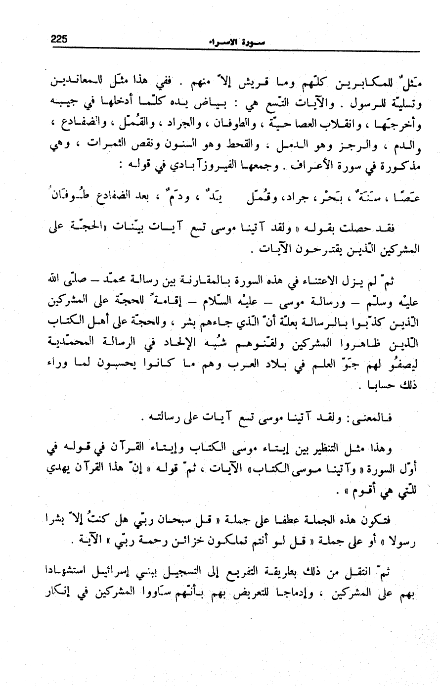 فَقَدْ حَصَلَتْ بِقَوْلِهِ: وَلَقَدْ آتَيْنا مُوسى تِسْعَ آياتٍ بَيِّناتٍ الْحُجَّةُ عَلَى الْمُشْرِكِينَ الَّذِينَ يَقْتَرِحُونَ الْآيَاتِ.