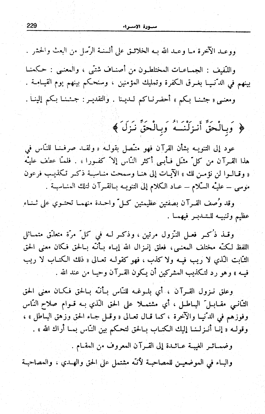 وَبِالْحَقِّ أَنْزَلْناهُ وَبِالْحَقِّ نَزَلَ وَما أَرْسَلْناكَ إِلاَّ مُبَشِّراً وَنَذِيراً (105)