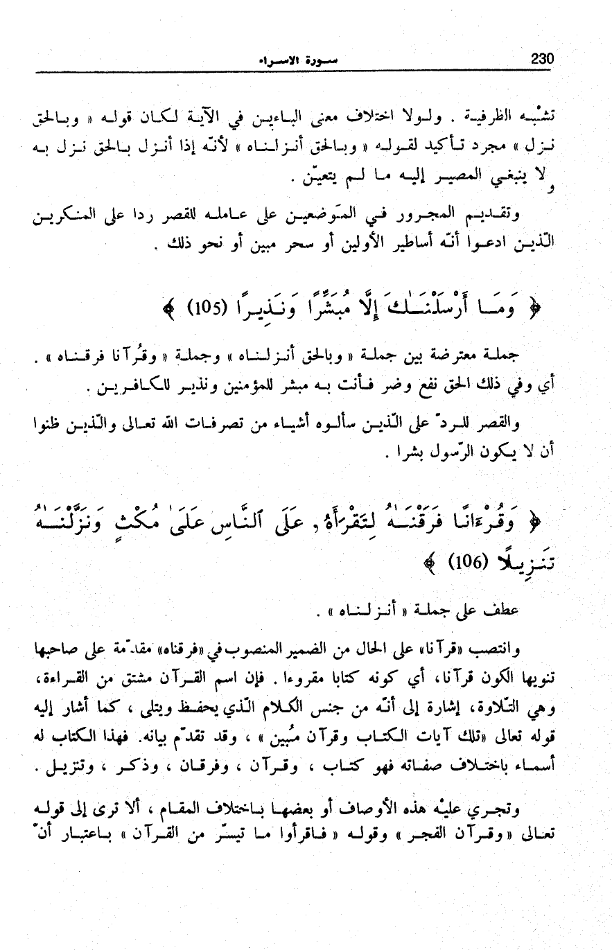 وَانْتَصَبَ قُرْآناً عَلَى الْحَالِ مِنَ الضَّمِيرِ الْمَنْصُوبِ فِي فَرَقْناهُ مُقَدَّمَةً عَلَى صَاحِبِهَا تَنْوِيهًا الْكَوْنُ قُرْآنًا، أَيْ كَوْنُهُ كِتَابًا مَقْرُوءًا. فَإِنَّ اسْمَ الْقُرْآنِ مُشْتَقٌّ مِنَ الْقِرَاءَةِ، وَهِيَ التِّلَاوَةُ، إِشَارَةً إِلَى أَنَّهُ مِنْ جِنْسِ الْكَلَامِ الَّذِي يُحْفَظُ وَيُتْلَى، كَمَا أَشَارَ إِلَيْهِ قَوْلُهُ تَعَالَى: تِلْكَ آياتُ الْكِتابِ وَقُرْآنٍ مُبِينٍ [الْحجر: 1] ، وَقَدْ تَقَدَّمَ بَيَانُهُ. فَهَذَا الْكِتَابُ لَهُ أَسْمَاءٌ بِاخْتِلَافِ صِفَاتِهِ فَهُوَ كِتَابٌ، وَقُرْآنٌ، وَفُرْقَانٌ، وَذِكْرٌ، وَتَنْزِيلٌ.