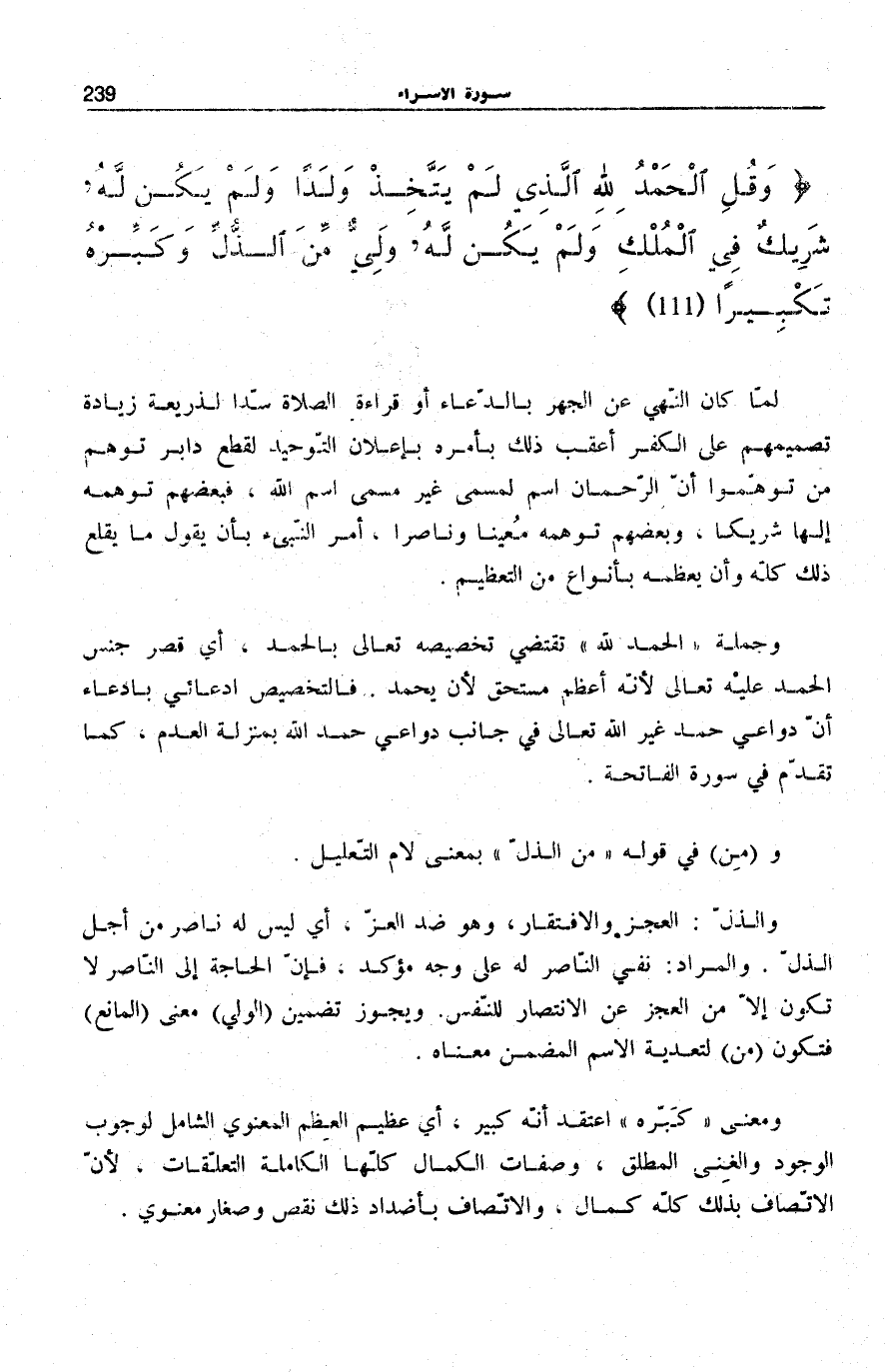 وَقُلِ الْحَمْدُ لِلَّهِ الَّذِي لَمْ يَتَّخِذْ وَلَداً وَلَمْ يَكُنْ لَهُ شَرِيكٌ فِي الْمُلْكِ وَلَمْ يَكُنْ لَهُ وَلِيٌّ مِنَ الذُّلِّ وَكَبِّرْهُ تَكْبِيراً (111)