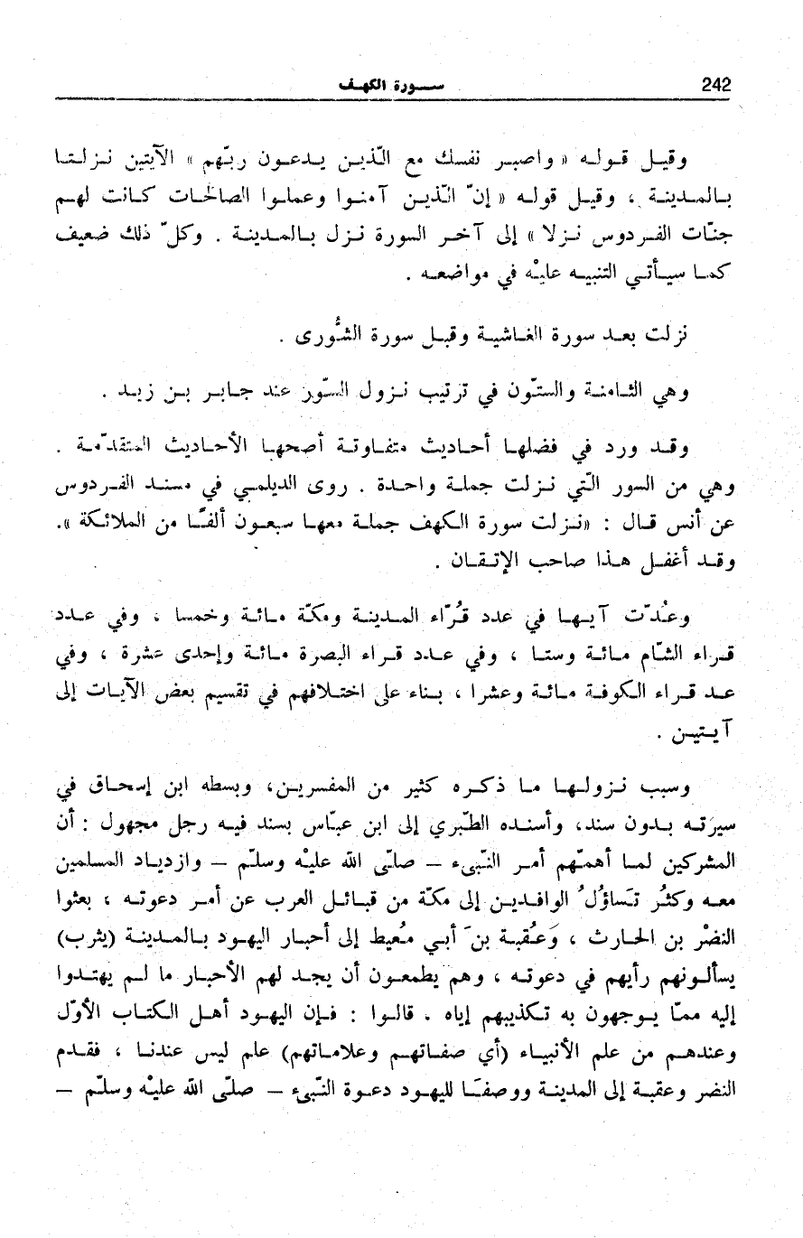 وَقِيلَ قَوْلُهُ: وَاصْبِرْ نَفْسَكَ مَعَ الَّذِينَ يَدْعُونَ رَبَّهُمْ [الْكَهْف: 28] الْآيَتَيْنِ نَزَلَتَا بِالْمَدِينَةِ، وَقِيلَ قَوْلُهُ: إِنَّ الَّذِينَ آمَنُوا وَعَمِلُوا الصَّالِحاتِ كانَتْ لَهُمْ جَنَّاتُ الْفِرْدَوْسِ نُزُلًا [الْكَهْف: 107] إِلَى آخِرِ السُّورَةِ نَزَلَ بِالْمَدِينَةِ. وَكُلُّ ذَلِكَ ضَعِيفٌ كَمَا سَيَأْتِي التَّنْبِيهُ عَلَيْهِ فِي مَوَاضِعِهِ.
