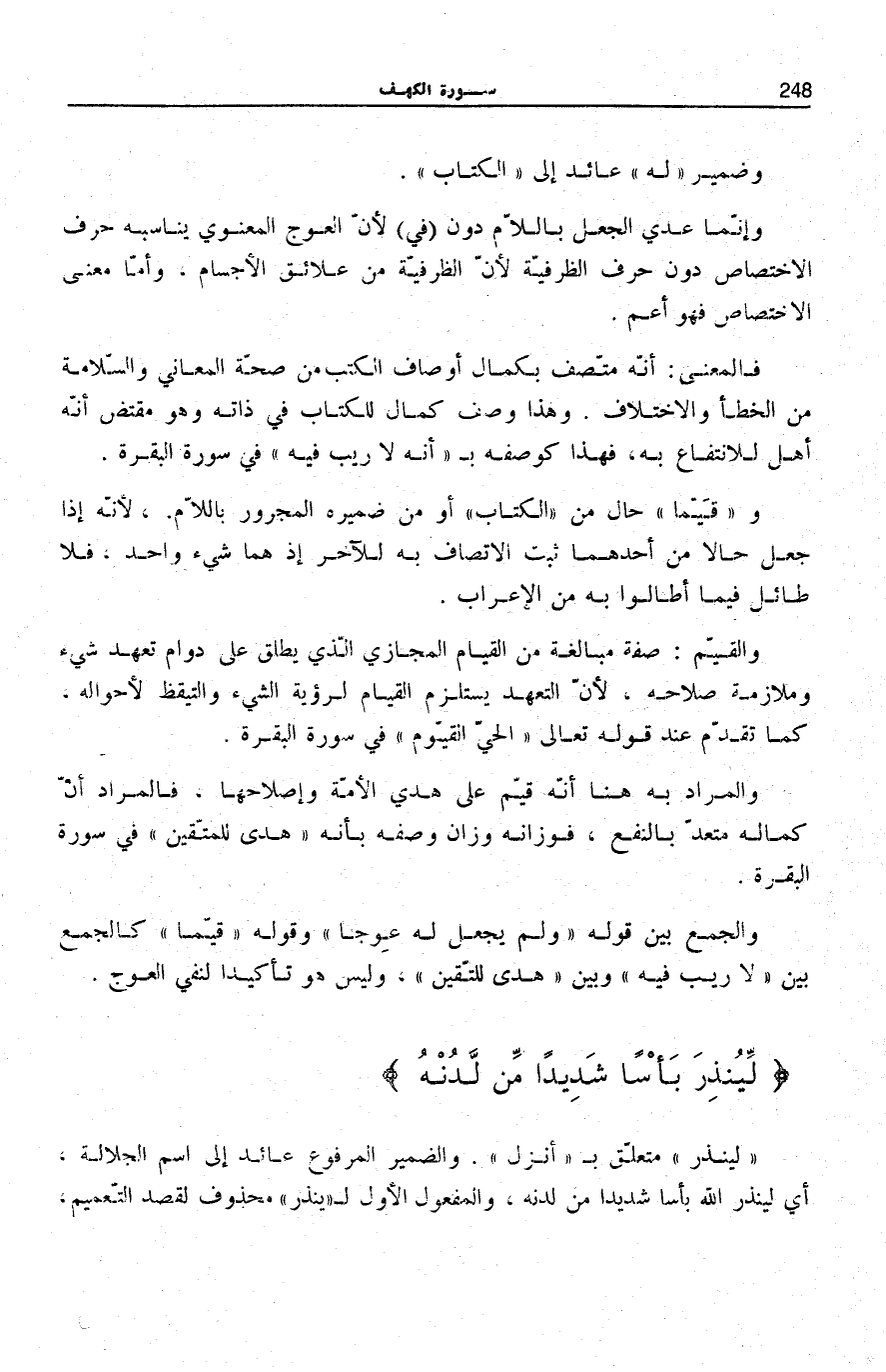 وَالْجَمْعُ بَيْنَ قَوْلِهِ: وَلَمْ يَجْعَلْ لَهُ عِوَجاً وَقَوْلِهِ: قَيِّماً كَالْجَمْعِ بَيْنَ لَا رَيْبَ فِيهِ [الْبَقَرَة: 2] وَبَيْنَ هُدىً لِلْمُتَّقِينَ [الْبَقَرَة: 2] وَلَيْسَ هُوَ تَأْكِيدًا لِنَفْيِ الْعِوَجِ.