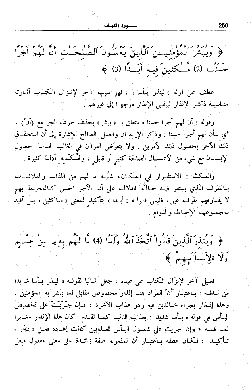 وَيُبَشِّرَ الْمُؤْمِنِينَ الَّذِينَ يَعْمَلُونَ الصَّالِحاتِ أَنَّ لَهُمْ أَجْراً حَسَناً (2) ماكِثِينَ فِيهِ أَبَداً (3) عُطِفَ عَلَى قَوْلِهِ: لِيُنْذِرَ بَأْساً، فَهُوَ سَبَبٌ آخَرُ لِإِنْزَالِ الْكِتَابِ أَثَارَتْهُ مُنَاسَبَةُ ذِكْرِ الْإِنْذَارِ لِيَبْقَى الْإِنْذَارُ مُوَجَّهًا إِلَى غَيْرِهِمْ.
