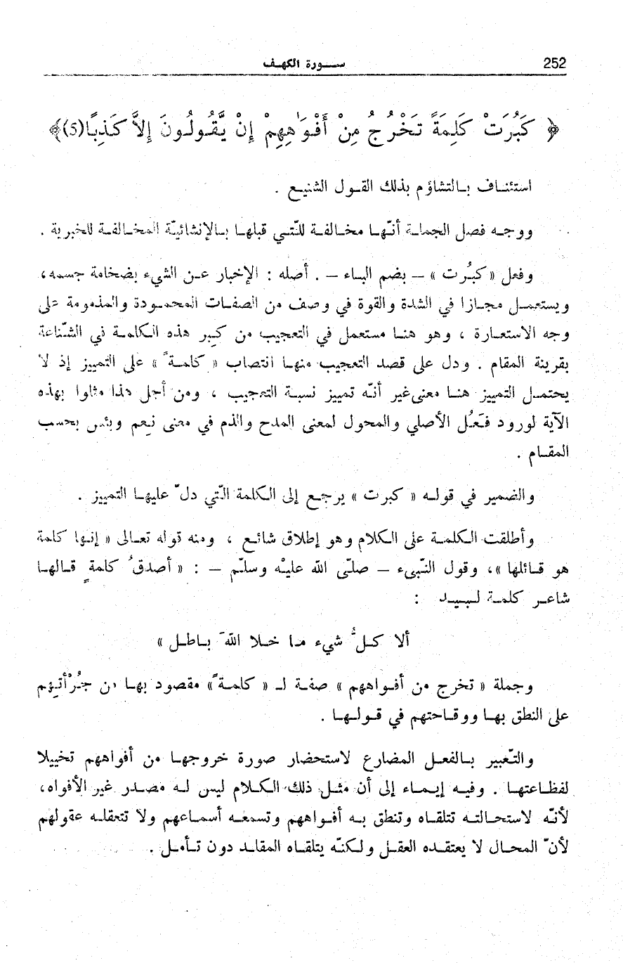 كَبُرَتْ كَلِمَةً تَخْرُجُ مِنْ أَفْواهِهِمْ إِنْ يَقُولُونَ إِلَّا كَذِباً اسْتِئْنَافٌ بِالتَّشَاؤُمِ بِذَلِكَ الْقَوْلِ الشَّنِيعِ.
