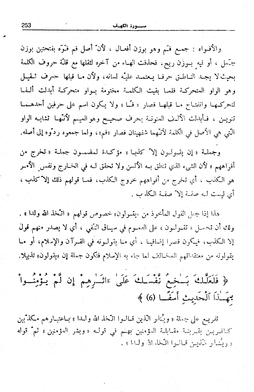 وَالْأَفْوَاهُ: جمع فَم وَهُوَ بِوَزْنِ أَفْعَالٍ، لِأَنَّ أَصْلَ فَمٍ فَوَهٌ بِفَتْحَتَيْنِ بِوَزْنِ جَمَلٍ، أَوْ فِيهٍ بِوَزْنِ رِيحٍ، فَحُذِفَتِ الْهَاءُ مِنْ آخِرِهِ لِثِقَلِهَا مَعَ قلَّة حُرُوف الْكَلِمَةِ بِحَيْثُ لَا يَجِدُ النَّاطِقُ حَرْفًا يَعْتَمِدُ عَلَيْهِ لِسَانُهُ، وَلِأَنَّ مَا قَبْلَهَا حَرْفٌ ثَقِيلٌ وَهُوَ الْوَاوُ الْمُتَحَرِّكَةُ فَلَمَّا بَقِيَتِ الْكَلِمَةُ مَخْتُومَةً بِوَاوٍ مُتَحَرِّكَةٍ أُبْدِلَتْ أَلْفًا لِتَحَرُّكِهَا وَانْفِتَاحِ مَا قَبْلَهَا فَصَارَ «فًا» وَلَا يَكُونُ اسْمٌ عَلَى حَرْفَيْنِ أَحَدُهُمَا تَنْوِينٌ، فَأُبْدِلَتِ الْأَلِفُ الْمُنَوَّنَةُ بِحَرْفٍ صَحِيحٍ وَهُوَ الْمِيمُ لِأَنَّهَا تُشَابِهُ الْوَاوَ الَّتِي هِيَ الْأَصْلُ فِي الْكَلِمَةِ لِأَنَّهُمَا شَفَهِيَّتَانِ فَصَارَ «فَمٌ» ، وَلَمَّا جَمَعُوهُ رَدُّوهُ إِلَى أَصْلِهِ.