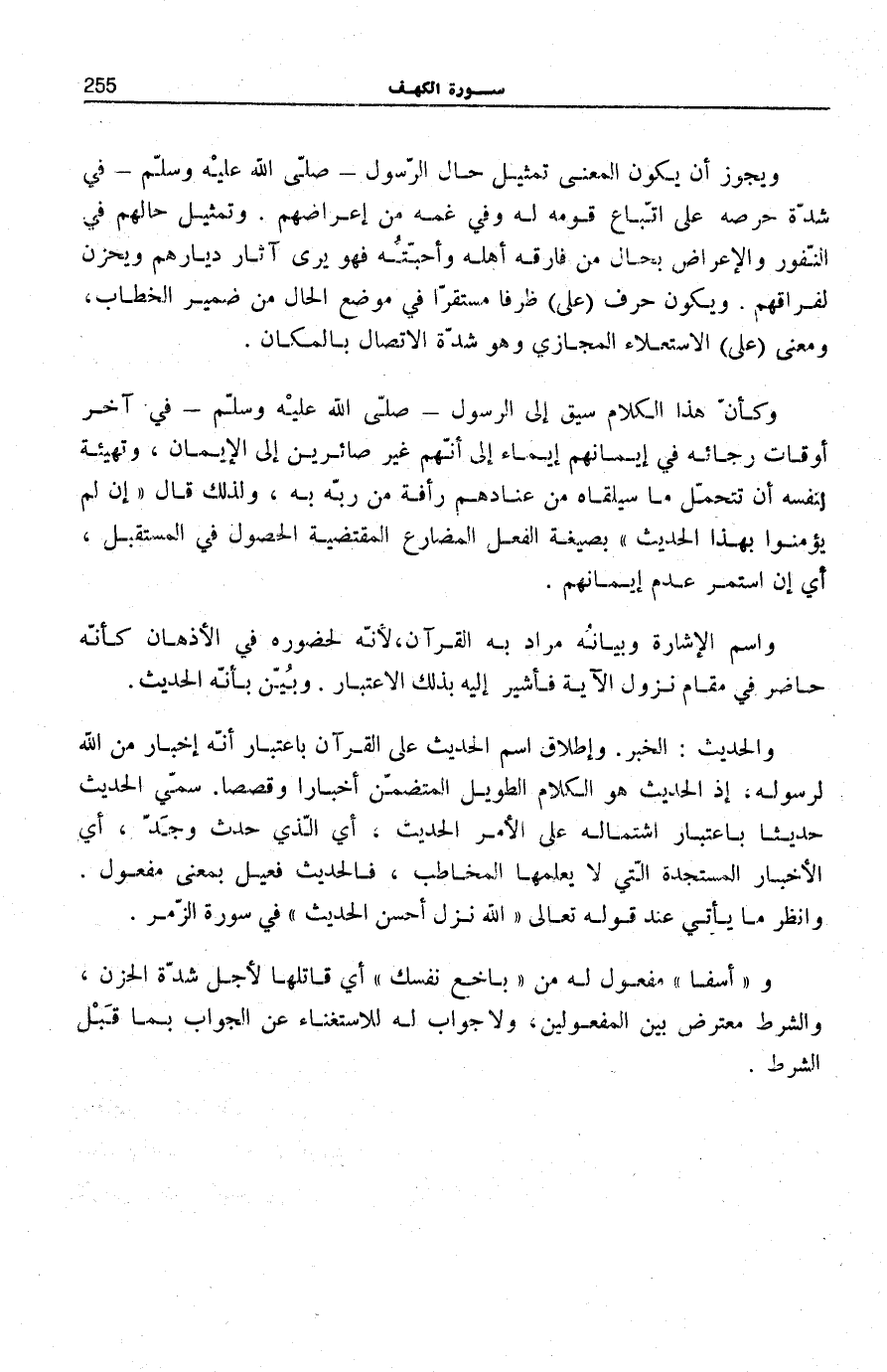 وأَسَفاً مَفْعُولٌ لَهُ مِنْ باخِعٌ نَفْسَكَ أَيْ قَاتِلُهَا لِأَجْلِ شَدَّةِ الْحُزْنِ، وَالشَّرْطُ مُعْتَرِضٌ بَيْنَ الْمَفْعُولَيْنِ، وَلَا جَوَابَ لَهُ لِلِاسْتِغْنَاءِ عَنِ الْجَوَابِ بِمَا قبل الشَّرْط.