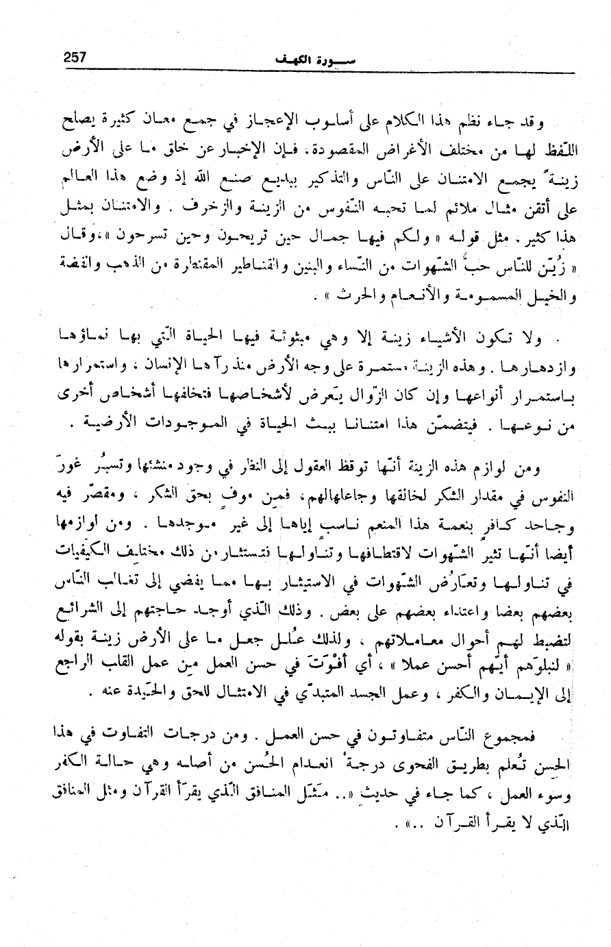 وَقَدْ جَاءَ نَظْمُ هَذَا الْكَلَامِ عَلَى أُسْلُوبِ الْإِعْجَازِ فِي جَمْعِ مُعَانٍ كَثِيرَةٍ يَصْلُحُ اللَّفْظُ لَهَا من مُخْتَلف الْأَغْرَاض الْمَقْصُودَةِ، فَإِنَّ الْإِخْبَارَ عَنْ خَلْقِ مَا عَلَى الْأَرْضِ زِينَةً يَجْمَعُ الِامْتِنَانَ عَلَى النَّاسِ وَالتَّذْكِيرَ بِبَدِيعِ صُنْعِ اللَّهِ إِذْ وَضَعَ هَذَا الْعَالَمَ عَلَى أَتْقَنِ مِثَالٍ مُلَائِمٍ لِمَا تُحِبُّهُ النُّفُوسُ مِنَ الزِّينَةِ وَالزُّخْرُفِ. وَالِامْتِنَانُ بِمِثْلِ هَذَا كَثِيرٌ، مِثْلُ قَوْلِهِ: وَلَكُمْ فِيها جَمالٌ حِينَ تُرِيحُونَ وَحِينَ تَسْرَحُونَ [النَّحْل: 6] ، وَقَالَ: زُيِّنَ لِلنَّاسِ حُبُّ الشَّهَواتِ مِنَ النِّساءِ وَالْبَنِينَ وَالْقَناطِيرِ الْمُقَنْطَرَةِ مِنَ الذَّهَبِ وَالْفِضَّةِ وَالْخَيْلِ الْمُسَوَّمَةِ وَالْأَنْعامِ وَالْحَرْثِ [آل عمرَان: 14] .