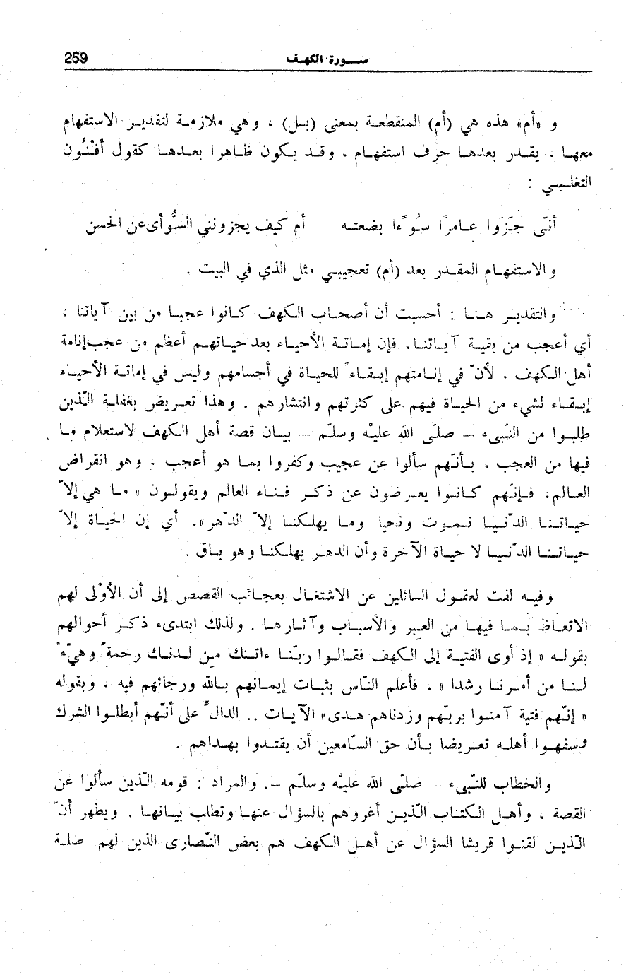 وَالتَّقْدِيرُ هُنَا: أَحَسِبْتَ أَنَّ أَصْحَابَ الْكَهْفِ كَانُوا عَجَبًا مِنْ بَيْنِ آيَاتِنَا، أَيْ أَعْجَبَ مِنْ بَقِيَّةِ آيَاتِنَا، فَإِنَّ إِمَاتَةَ الْأَحْيَاءِ بَعْدَ حَيَاتِهِمْ أَعْظَمُ مِنْ عَجَبِ إِنَامَةِ أَهْلِ الْكَهْفِ. لِأَنَّ فِي إِنَامَتِهِمْ إِبْقَاءٌ لِلْحَيَاةِ فِي أَجْسَامِهِمْ وَلَيْسَ فِي إِمَاتَةِ الْأَحْيَاءِ إِبْقَاءٌ لِشَيْءٍ مِنَ الْحَيَاةِ فِيهِمْ عَلَى كَثْرَتِهِمْ وَانْتِشَارِهِمْ. وَهَذَا تَعْرِيضٌ بِغَفْلَةِ الَّذِينَ طَلَبُوا من النبيء صلّى الله عَلَيْهِ وَآله وسلّم بَيَانَ قِصَّةِ أَهْلِ الْكَهْفِ لِاسْتِعْلَامِ مَا فِيهَا مِنَ الْعَجَبِ، بِأَنَّهُمْ سَأَلُوا عَنْ عَجِيبٍ وَكَفَرُوا بِمَا هُوَ أَعْجَبُ، وَهُوَ انْقِرَاضُ الْعَالَمِ، فَإِنَّهُمْ كَانُوا يُعْرِضُونَ عَنْ ذِكْرِ فَنَاءِ الْعَالَمِ وَيَقُولُونَ: مَا هِيَ إِلَّا حَياتُنَا الدُّنْيا نَمُوتُ وَنَحْيا وَما يُهْلِكُنا إِلَّا الدَّهْرُ [الجاثية: 24] . أَيْ إِنِ الْحَيَاةُ إِلَّا حَيَاتُنَا الدُّنْيَا لَا حَيَاةُ الْآخِرَةُ وَإِنَّ الدَّهْرَ يُهْلِكُنَا وَهُوَ بَاقٍ.