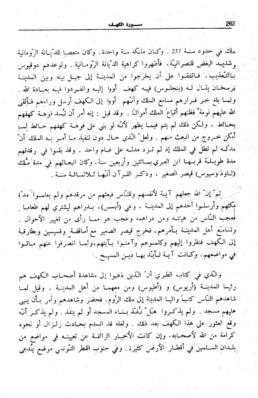 وَالَّذِي فِي «كِتَابِ الطَّبَرِيِّ» أَنَّ الَّذِينَ ذَهَبُوا إِلَى مُشَاهَدَةِ أَصْحَابِ الْكَهْفِ هُمْ رَئِيسَا الْمَدِينَةِ (أَرْيُوسْ) وَ (أَطْيُوسْ) وَمَنْ مَعَهُمَا مِنْ أَهْلِ الْمَدِينَةِ، وَقِيلَ لَمَّا شَاهَدَهُمُ النَّاسُ كَتَبَ وَالِيَا الْمَدِينَةِ إِلَى مَلِكِ الرُّومِ، فَحَضَرَ وَشَاهَدَهُمْ وَأَمَرَ بِأَنْ يُبْنَى عَلَيْهِمْ مَسْجِدٌ. وَلَمْ يَذْكُرُوا هَلْ نُفِّذَ بِنَاءُ الْمَسْجِدِ أَوْ لَمْ يُنَفَّذْ. وَلَمْ يُذْكَرْ أَنَّهُ وَقَعَ الْعُثُورُ عَلَى هَذَا الْكَهْفِ بَعْدَ ذَلِكَ.