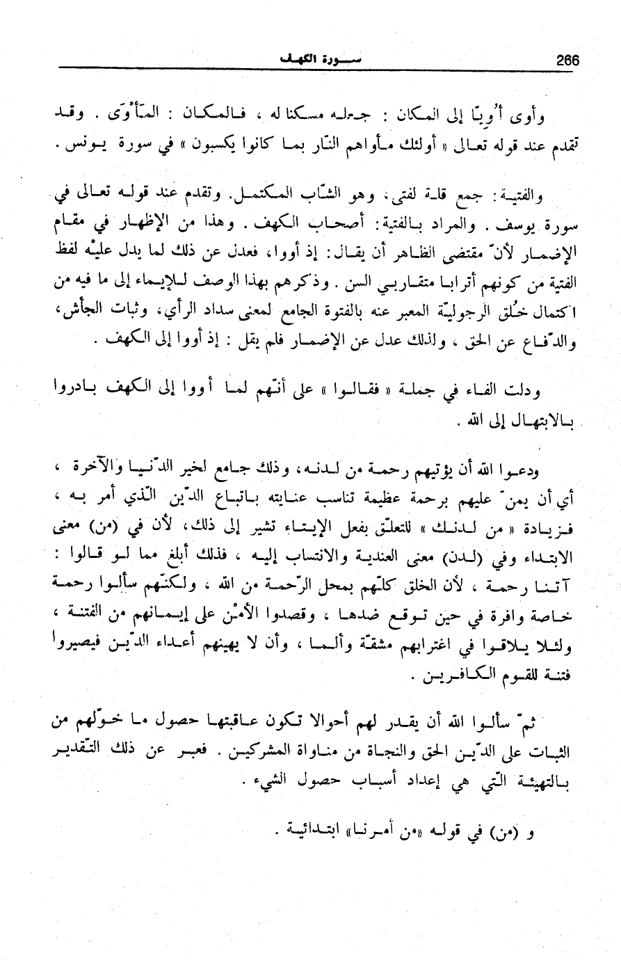 وَالْفِتْيَةُ: جمع قلَّة لفتى، وَهُوَ الشَّابُّ الْمُكْتَمِلُ. وَتَقَدَّمَ عِنْدَ قَوْلِهِ تَعَالَى فِي سُورَةِ يُوسُفَ. وَالْمُرَادُ بِالْفِتْيَةِ: أَصْحَابُ الْكَهْفِ. وَهَذَا مِنَ الْإِظْهَارِ فِي مَقَامِ الْإِضْمَارِ لِأَنَّ مُقْتَضَى الظَّاهِرِ أَنْ يُقَالَ: إِذْ أَوَوْا، فَعَدَلَ عَنْ ذَلِكَ لِمَا يَدُلُّ عَلَيْهِ لَفْظُ الْفِتْيَةِ مِنْ كَوْنِهِمْ أَتْرَابًا مُتَقَارِبِي السِّنِّ. وَذَكَرَهُمْ بِهَذَا الْوَصْفِ لِلْإِيمَاءِ إِلَى مَا فِيهِ مِنِ اكْتِمَالِ خَلْقِ الرُّجُولِيَّةِ الْمُعَبَّرِ عَنْهُ بِالْفُتُوَّةِ الْجَامِعِ لِمَعْنَى سَدَادِ الرَّأْيِ، وَثَبَاتِ الْجَأْشِ، وَالدِّفَاعِ عَنِ الْحَقِّ، وَلِذَلِكَ عَدَلَ عَنِ الْإِضْمَارِ فَلَمْ يَقِلْ: إِذْ أَوَوْا إِلَى الْكَهْفِ.