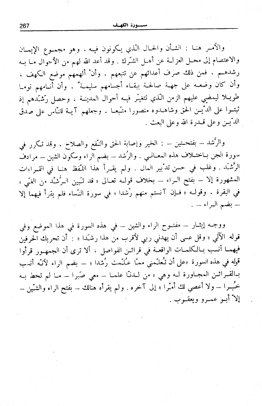 وَوَجْهُ إِيثَارِ- مَفْتُوحِ الرَّاءِ وَالشِّينِ- فِي هَذِهِ السُّورَةِ فِي هَذَا الْمَوْضِعِ وَفِي قَوْلِهِ الْآتِي: وَقُلْ عَسى أَنْ يَهْدِيَنِ رَبِّي لِأَقْرَبَ مِنْ هَذَا رَشَداً [الْكَهْف: 24] : أَنَّ تَحْرِيكَ الْحَرْفَيْنِ فِيهِمَا أَنْسَبُ بِالْكَلِمَاتِ الْوَاقِعَةِ فِي قَرَائِنِ الْفَوَاصِلِ أَلَا تَرَى أَن الْجُمْهُور قرؤوا قَوْلَهُ فِي هَذِهِ السُّورَةِ: عَلى أَنْ تُعَلِّمَنِ مِمَّا عُلِّمْتَ رُشْداً [الْكَهْف: 66]- بِضَمِّ الرَّاءِ لِأَنَّهُ أَنْسَبُ بِالْقَرَائِنِ الْمُجَاوِرَةِ لَهُ وَهِيَ مِنْ لَدُنَّا عِلْماً [الْكَهْف: 65]- مَعِيَ صَبْراً