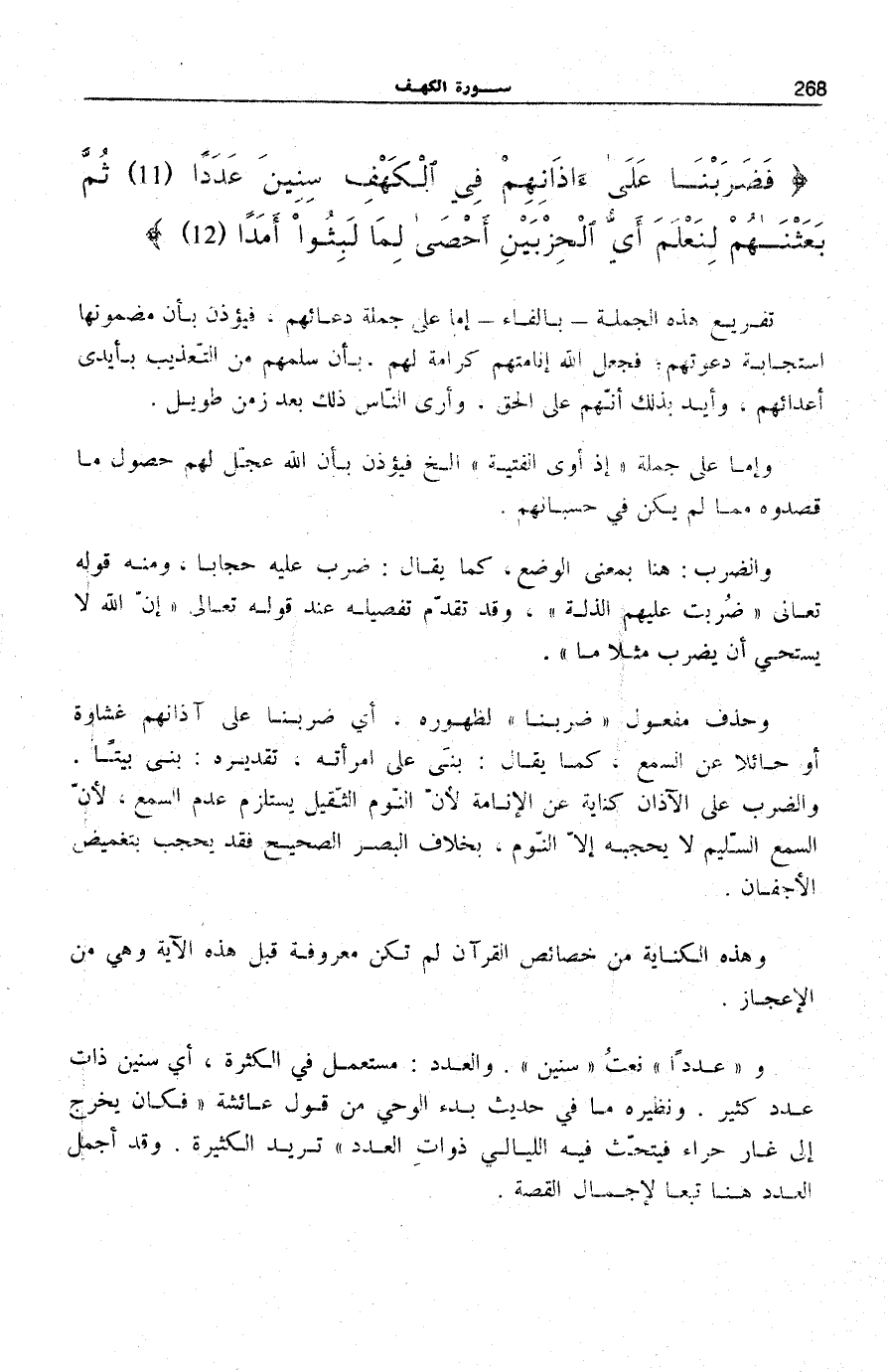 وَحذف مفعول فَضَرَبْنا لِظُهُورِهِ، أَيْ ضَرَبْنَا عَلَى آذَانِهِمْ غِشَاوَةً أَوْ حَائِلًا عَنِ السَّمْعِ، كَمَا يُقَالُ: بَنَى عَلَى امْرَأَتِهِ، تَقْدِيرُهُ: بَنَى بَيْتًا. وَالضَّرْبُ عَلَى الْآذَانِ كِنَايَةٌ عَنِ الْإِنَامَةِ لِأَنَّ النَّوْمَ الثَّقِيلَ يَسْتَلْزِمُ عَدَمَ السَّمْعِ، لِأَنَّ السَّمْعَ السَّلِيمَ لَا يَحْجُبُهُ إِلَّا النَّوْمُ، بِخِلَافِ الْبَصَرِ الصَّحِيحِ فَقَدْ يُحْجَبُ بِتَغْمِيضِ الْأَجْفَانِ.