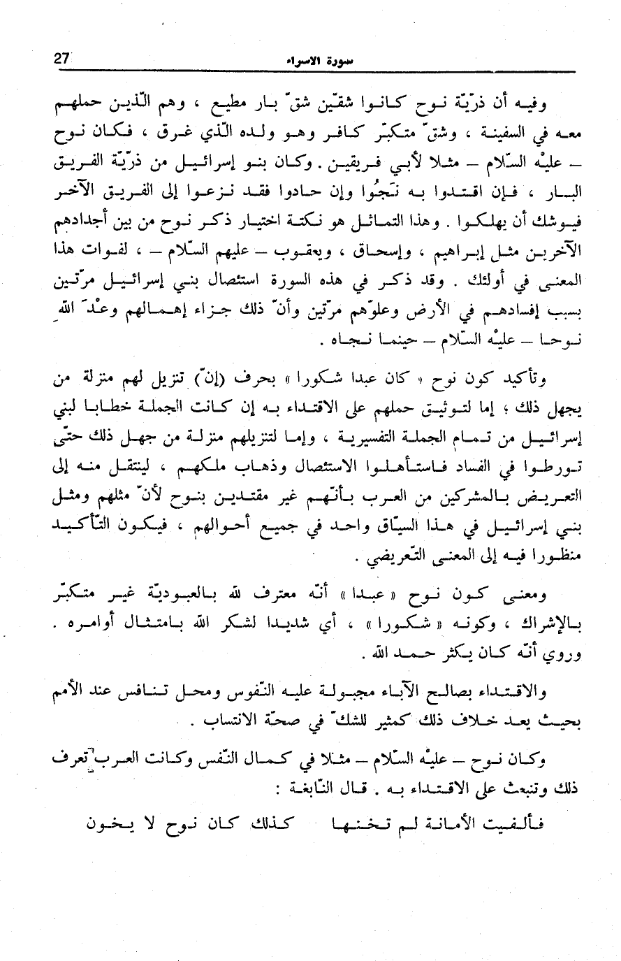 وَتَأْكِيدُ كَوْنِ نُوحٍ كانَ عَبْداً شَكُوراً بِحَرْفِ (إِنَّ) تَنْزِيلٌ لَهُمْ مَنْزِلَةَ مَنْ يَجْهَلُ ذَلِكَ إِمَّا لِتَوْثِيقِ حَمْلِهِمْ عَلَى الِاقْتِدَاءِ بِهِ إِنْ كَانَتِ الْجُمْلَةُ خِطَابًا لِبَنِي إِسْرَائِيلَ مِنْ تَمَامِ الْجُمْلَةِ التَّفْسِيرِيَّةِ، وَإِمَّا لِتَنْزِيلِهِمْ مَنْزِلَةَ مَنْ جَهِلَ ذَلِكَ حَتَّى تَوَرَّطُوا فِي الْفَسَادِ فَاسْتَأْهَلُوا الِاسْتِئْصَالَ وَذَهَابَ مُلْكِهِمْ، لِيَنْتَقِلَ مِنْهُ إِلَى التَّعْرِيضِ بِالْمُشْرِكِينَ مِنَ الْعَرَبِ بِأَنَّهُمْ غَيْرُ مُقْتَدِينَ بِنُوحٍ لِأَنَّ مَثَلَهُمْ وَمَثَلَ بَنِي إِسْرَائِيلَ فِي هَذَا السِّيَاقِ وَاحِدٌ فِي جَمِيعِ أَحْوَالِهِمْ، فَيَكُونُ التَّأْكِيدُ مَنْظُورًا فِيهِ إِلَى الْمَعْنَى التَّعْرِيضِيِّ.