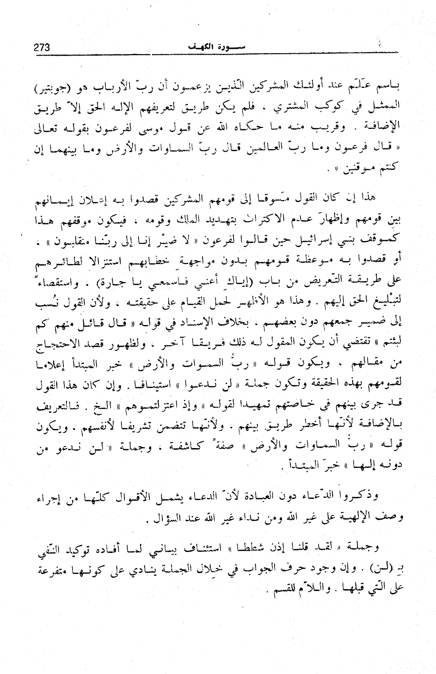 هَذَا إِنْ كَانَ الْقَوْلُ مَسُوقًا إِلَى قَوْمِهِمُ الْمُشْرِكِينَ قَصَدُوا بِهِ إِعْلَانَ إِيمَانِهِمْ بَيْنَ قَوْمِهِمْ وَإِظْهَارَ عَدَمِ الِاكْتِرَاثِ بِتَهْدِيدِ الْمَلِكِ وَقَوْمِهِ، فَيَكُونُ مَوْقِفُهُمْ هَذَا كَمَوْقِفِ بَنِي إِسْرَائِيلَ حِينَ قَالُوا لِفِرْعَوْنَ لَا ضَيْرَ إِنَّا إِلى رَبِّنا مُنْقَلِبُونَ [الشُّعَرَاء: 50] ، أَوْ قَصَدُوا بِهِ مَوْعِظَةَ قَوْمِهِمْ بِدُونِ مُوَاجَهَةِ خِطَابِهِمْ اسْتِنْزَالًا لِطَائِرِهِمْ عَلَى طَرِيقَةِ التَّعْرِيضِ مِنْ بَابِ (إِيَّاكِ أَعْنِي فَاسْمَعِي يَا جَارَةُ) ، وَاسْتِقْصَاءً لِتَبْلِيغِ الْحَقِّ إِلَيْهِمْ. وَهَذَا هُوَ الْأَظْهَرُ لِحَمْلِ الْقِيَامِ عَلَى حَقِيقَتِهِ، وَلِأَنَّ الْقَوْلَ نُسِبَ إِلَى ضَمِيرِ جَمْعِهِمْ دُونَ بَعْضِهِمْ، بِخِلَافِ الْإِسْنَادِ فِي قَوْلِهِ: قالَ قائِلٌ مِنْهُمْ كَمْ لَبِثْتُمْ [الْكَهْف: 19] تَقْتَضِي أَنْ يَكُونَ الْمَقُولُ لَهُ ذَلِكَ فَرِيقًا آخَرَ، وَلِظُهُورِ قَصْدِ الِاحْتِجَاجِ مِنْ مَقَالِهِمْ، وَيَكُونُ قَوْلُهُ: رَبُّ السَّماواتِ وَالْأَرْضِ خَبَرُ الْمُبْتَدَأِ إِعْلَامًا لِقَوْمِهِمْ بِهَذِهِ الْحَقِيقَةِ وَتَكُونُ جملَة لَنْ نَدْعُوَا اسْتِئْنَافًا. وَإِنْ كَانَ هَذَا الْقَوْلُ قَدْ جَرَى بَيْنَهُمْ فِي خَاصَّتِهِمْ تَمْهِيدًا لِقَوْلِهِ: وَإِذِ اعْتَزَلْتُمُوهُمْ [الْكَهْف: 16] إِلَخْ. فَالتَّعْرِيفُ بِالْإِضَافَةِ لِأَنَّهَا أَخْطَرُ طَرِيقٍ بَيْنَهُمْ، وَلِأَنَّهَا تَتَضَمَّنُ تَشْرِيفًا لِأَنْفُسِهِمْ، وَيَكُونُ قَوْلُهُ: رَبُّ السَّماواتِ وَالْأَرْضِ صِفَةً كَاشِفَةً، وَجُمْلَة لَنْ نَدْعُوَا مِنْ دُونِهِ إِلهاً خبر الْمُبْتَدَأ.