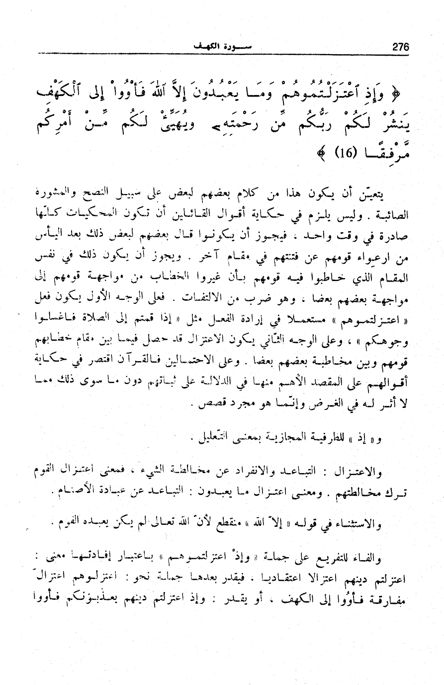 وَلَيْسَ يَلْزَمُ فِي حِكَايَةِ أَقْوَالِ الْقَائِلِينَ أَنْ تَكُونَ الْمَحْكِيَّاتُ كُلُّهَا صَادِرَةً فِي وَقْتٍ وَاحِدٍ، فَيَجُوزُ أَنْ يَكُونُوا قَالَ بَعْضُهُمْ لِبَعْضٍ ذَلِكَ بَعْدَ الْيَأْسِ مِنِ ارْعِوَاءِ قَوْمِهِمْ عَنْ فِتْنَتِهِمْ فِي مَقَامٍ آخَرَ. وَيَجُوزُ أَنْ يَكُونَ ذَلِكَ فِي نَفْسِ الْمَقَامِ الَّذِي خَاطَبُوا فِيهِ قَوْمَهُمْ بِأَنْ غَيَّرُوا الْخِطَابَ مِنْ مُوَاجَهَةِ قَوْمِهِمْ إِلَى مُوَاجَهَةِ بَعْضِهِمْ بَعْضًا، وَهُوَ ضَرْبٌ مِنَ الِالْتِفَاتِ. فَعَلَى الْوَجْهِ الْأَوَّلِ يَكُونُ فِعْلُ اعْتَزَلْتُمُوهُمْ مُسْتَعْمَلًا فِي إِرَادَةِ الْفِعْلِ مِثْلُ إِذا قُمْتُمْ إِلَى الصَّلاةِ فَاغْسِلُوا وُجُوهَكُمْ [الْمَائِدَة: 6] ، وَعَلَى الْوَجْهِ الثَّانِي يَكُونُ الِاعْتِزَالُ قَدْ حَصَلَ فِيمَا بَيْنَ مَقَامِ خِطَابِهِمْ قَوْمَهُمْ وَبَيْنَ مُخَاطَبَةِ بَعْضِهِمْ بَعْضًا. وَعَلَى الِاحْتِمَالَيْنِ فَالْقُرْآنُ اقْتَصَرَ فِي حِكَايَةِ أَقْوَالِهِمْ عَلَى الْمَقْصِدِ الْأَهَمِّ مِنْهَا فِي الدَّلَالَةِ عَلَى ثَبَاتِهِمْ دُونَ مَا سِوَى ذَلِكَ مِمَّا لَا أَثَرَ لَهُ فِي الْغَرَضِ وَإِنَّمَا هُوَ مُجَرَّدُ قَصَصٍ.