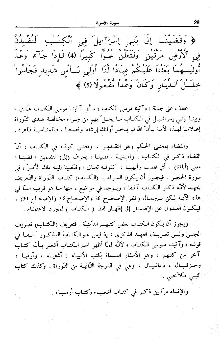 وَيَجُوزُ أَنْ يَكُونَ الْكِتَابُ بَعْضَ كُتُبِهِمُ الدِّينِيَّةِ. فَتَعْرِيفُ (الْكِتَابِ) تَعْرِيفُ الْجِنْسِ وَلَيْسَ تَعْرِيفَ الْعَهْدِ الذِّكْرِيِّ، إِذْ لَيْسَ هُوَ الْكِتَابُ الْمَذْكُورُ آنِفًا فِي قَوْلِهِ: وَآتَيْنا مُوسَى الْكِتابَ [الْإِسْرَاء: 2] لِأَنَّهُ لَمَّا أَظْهَرَ اسْمَ الْكِتَابِ أَشْعَرَ بِأَنَّهُ كِتَابٌ آخَرُ مِنْ كُتُبِهِمْ، وَهُوَ الْأَسْفَارُ الْمُسَمَّاةُ بِكُتُبِ الْأَنْبِيَاءِ: أَشْعِيَاءَ، وَأَرْمِيَا، وَحِزْقِيَالَ، وَدَانْيَالَ، وَهِيَ فِي الدَّرَجَةِ الثَّانِيَةِ مِنَ التَّوْرَاةِ. وَكَذَلِكَ كِتَابُ النَّبِيِّ مَلَاخِي.
