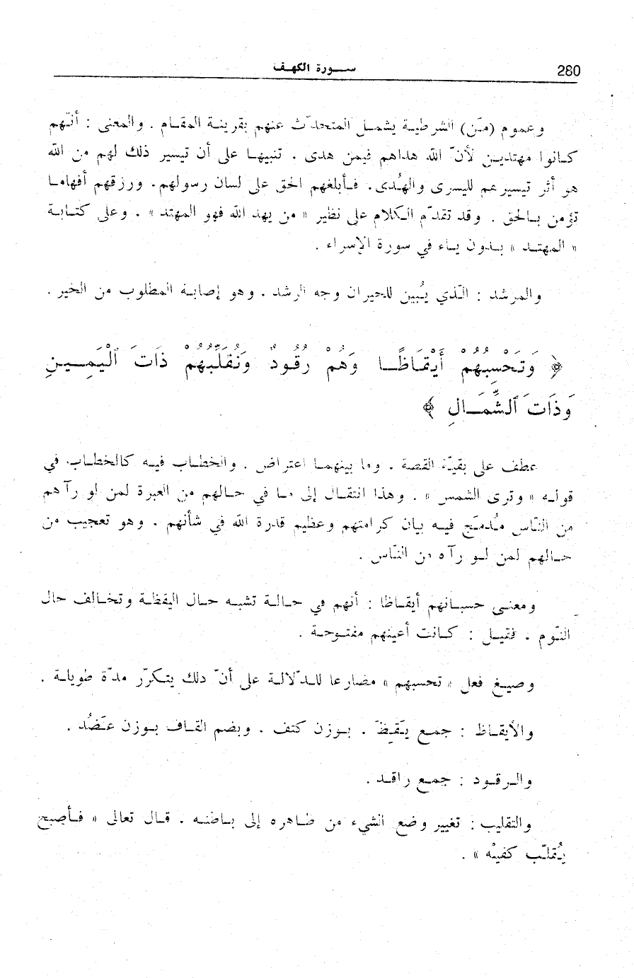 وَتَحْسَبُهُمْ أَيْقاظاً وَهُمْ رُقُودٌ وَنُقَلِّبُهُمْ ذاتَ الْيَمِينِ وَذاتَ الشِّمالِ وَكَلْبُهُمْ باسِطٌ ذِراعَيْهِ بِالْوَصِيدِ لَوِ اطَّلَعْتَ عَلَيْهِمْ لَوَلَّيْتَ مِنْهُمْ فِراراً وَلَمُلِئْتَ مِنْهُمْ رُعْباً (18)
