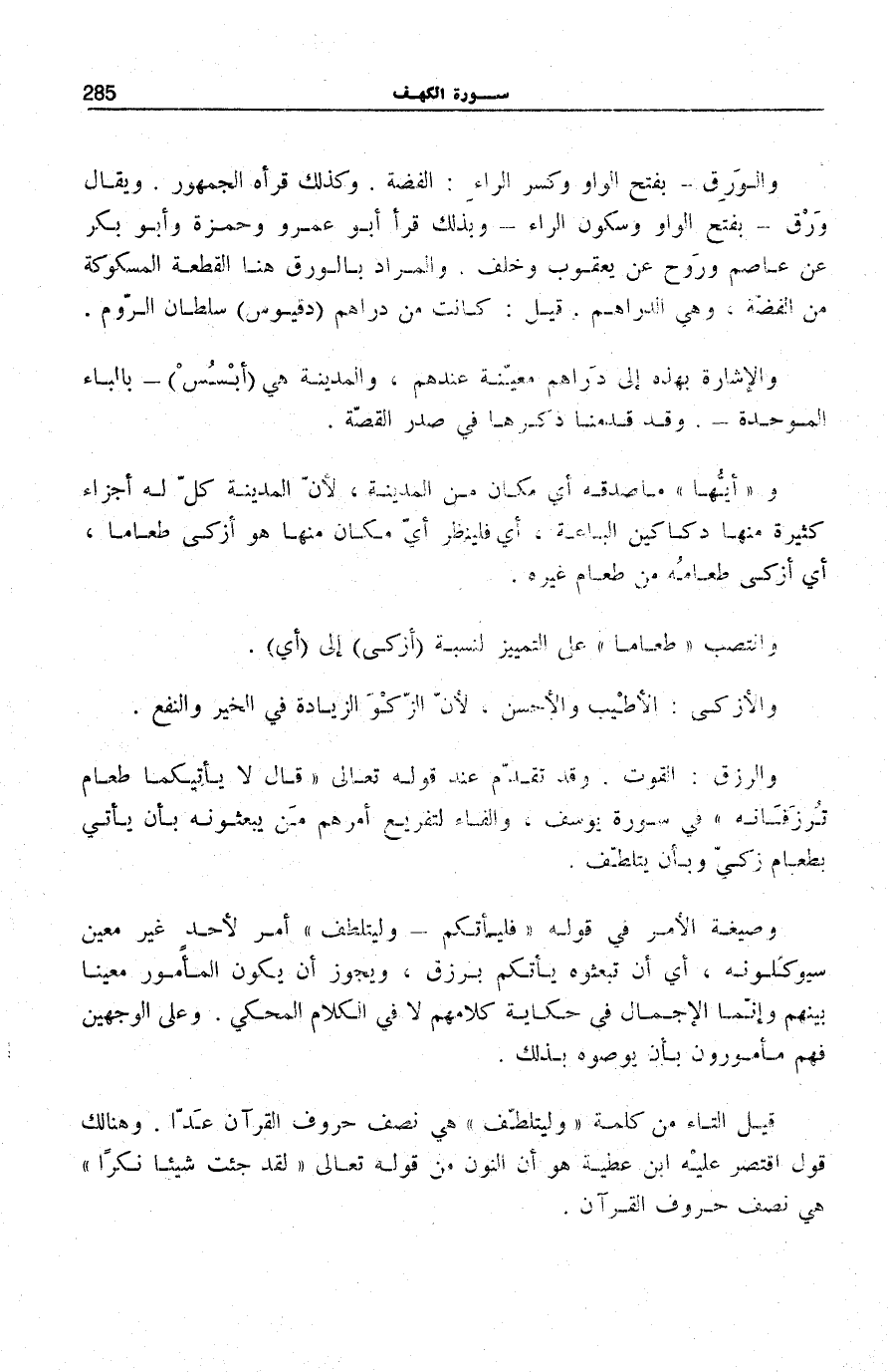 وأَيُّها مَا صدقه أَيُّ مَكَانٍ مِنَ الْمَدِينَةِ، لِأَنَّ الْمَدِينَةَ كُلٌّ لَهُ أَجْزَاءٌ كَثِيرَةٌ مِنْهَا دَكَاكِينُ الْبَاعَةِ، أَيْ فَلْيَنْظُرْ أَيَّ مَكَانٍ مِنْهَا هُوَ أَزْكَى طَعَامًا، أَيْ أَزْكَى طَعَامُهُ مِنْ طَعَام غَيره.