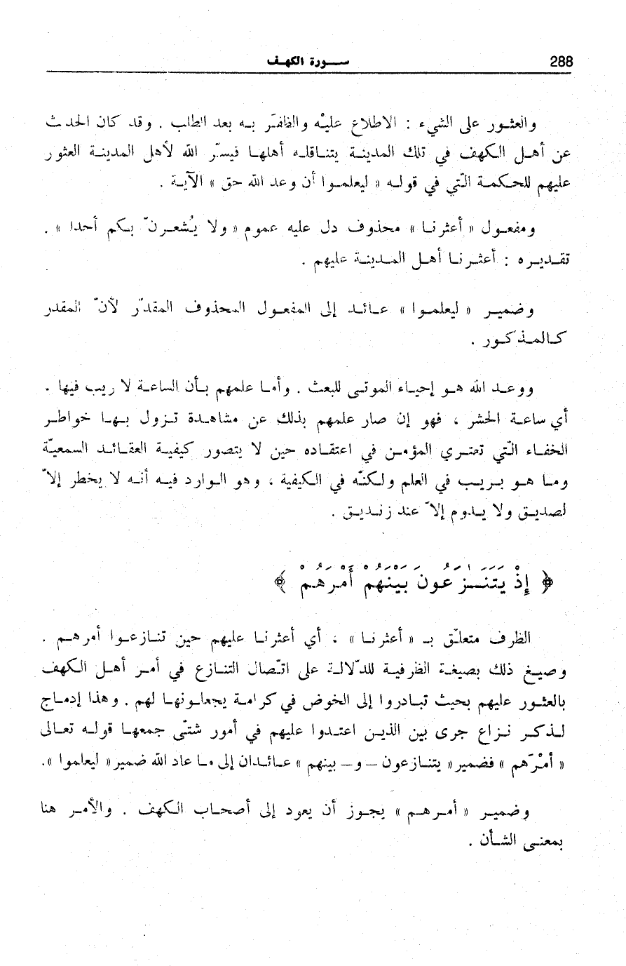 إِذْ يَتَنازَعُونَ بَيْنَهُمْ أَمْرَهُمْ الظَّرْفُ مُتَعَلِّقٌ بِ أَعْثَرْنا، أَيْ أَعْثَرْنَا عَلَيْهِمْ حِينَ تَنَازَعُوا أَمْرَهُمْ. وَصِيغَ ذَلِكَ بِصِيغَةِ الظَّرْفِيَّةِ لِلدَّلَالَةِ عَلَى اتِّصَالِ التَّنَازُعِ فِي أَمْرِ أَهْلِ الْكَهْفِ بِالْعُثُورِ عَلَيْهِمْ بِحَيْثُ تَبَادَرُوا إِلَى الْخَوْضِ فِي كَرَامَةٍ يَجْعَلُونَهَا لَهُمْ. وَهَذَا إِدْمَاجٌ لِذِكْرِ نِزَاعٍ جَرَى بَيْنَ الَّذِينَ اعْتَدَوْا عَلَيْهِمْ فِي أُمُورٍ شَتَّى جَمَعَهَا قَوْلُهُ تَعَالَى: أَمْرَهُمْ فَضَمِيرُ يَتَنازَعُونَ وبَيْنَهُمْ عَائِدَانِ إِلَى مَا عَادَ اللَّهُ ضَمِيرَ لِيَعْلَمُوا.