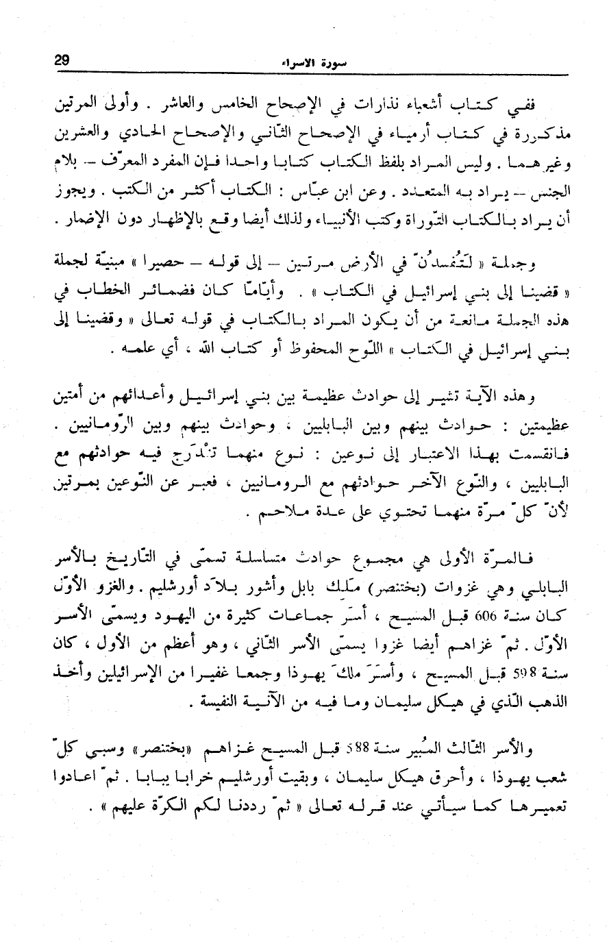 فَفِي كِتَابِ أَشْعِيَاءَ نِذَارَاتٌ فِي الْإِصْحَاحِ الْخَامِسِ وَالْعَاشِرِ. وَأُولَى الْمَرَّتَيْنِ مَذْكُورَةٌ فِي كِتَابِ أَرْمِيَاءَ فِي الْإِصْحَاحِ الثَّانِي وَالْإِصْحَاحِ الْحَادِي وَالْعِشْرِينَ وَغَيْرِهِمَا. وَلَيْسَ الْمُرَادُ بِلَفْظِ الْكِتَابِ كِتَابًا وَاحِدًا فَإِنَّ الْمُفْرَدَ الْمُعَرَّفَ- بِلَامِ الْجِنْسِ- يُرَادُ بِهِ الْمُتَعَدِّدُ. وَعَنِ ابْنِ عَبَّاسٍ الْكِتَابُ أَكْثَرُ مِنَ الْكُتُبِ. وَيَجُوزُ أَنْ يُرَادَ بِالْكِتَابِ التَّوْرَاةُ وَكُتُبُ الْأَنْبِيَاءِ وَلِذَلِكَ أَيْضًا وَقَعَ بِالْإِظْهَارِ دُونَ الْإِضْمَارِ.
