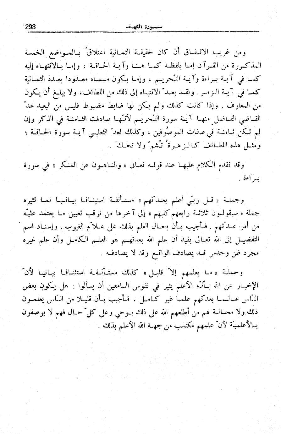 وَمِنْ غَرِيبِ الِاتِّفَاقِ أَنْ كَانَ لِحَقِيقَةِ الثَّمَانِيَةِ اعْتِلَاقٌ بِالْمَوَاضِعِ الْخَمْسَةِ الْمَذْكُورَةِ مِنَ الْقُرْآنِ إِمَّا بِلَفْظِهِ كَمَا هُنَا وَآيَةِ الْحَاقَّةَ، وَإِمَّا بِالِانْتِهَاءِ إِلَيْهِ كَمَا فِي آيَةِ بَرَاءَةَ وَآيَةِ التَّحْرِيمِ، وَإِمَّا بِكَوْنِ مُسَمَّاهُ مَعْدُودًا بِعَدَدِ الثَّمَانِيَةِ كَمَا فِي آيَةِ الزُّمَرِ. وَلَقَدْ يُعَدُ الِانْتِبَاهُ إِلَى ذَلِكَ مِنَ اللَّطَائِفِ، وَلَا يَبْلُغُ أَنْ يَكُونَ مِنَ الْمَعَارِفِ. وَإِذَا كَانَتْ كَذَلِكَ وَلَمْ يَكُنْ لَهَا ضَابِطٌ مَضْبُوطٌ فَلَيْسَ مِنَ الْبَعِيدِ عَدُّ الْقَاضِي الْفَاضِلِ مِنْهَا آيَةَ سُورَةِ التَّحْرِيمِ لِأَنَّهَا صَادَفَتِ الثَّامِنَةَ فِي الذِّكْرِ وَإِنْ لَمْ تكن ثامنة فِي صِفَاتِ الْمَوْصُوفِينَ، وَكَذَلِكَ لعد الثَّعْلَبِيّ آيَةِ سُورَةِ الْحَاقَّةِ وَمِثْلُ هَذِهِ اللَّطَائِفِ كَالزَّهْرَةِ تُشَمُّ وَلَا تُحَكُّ.