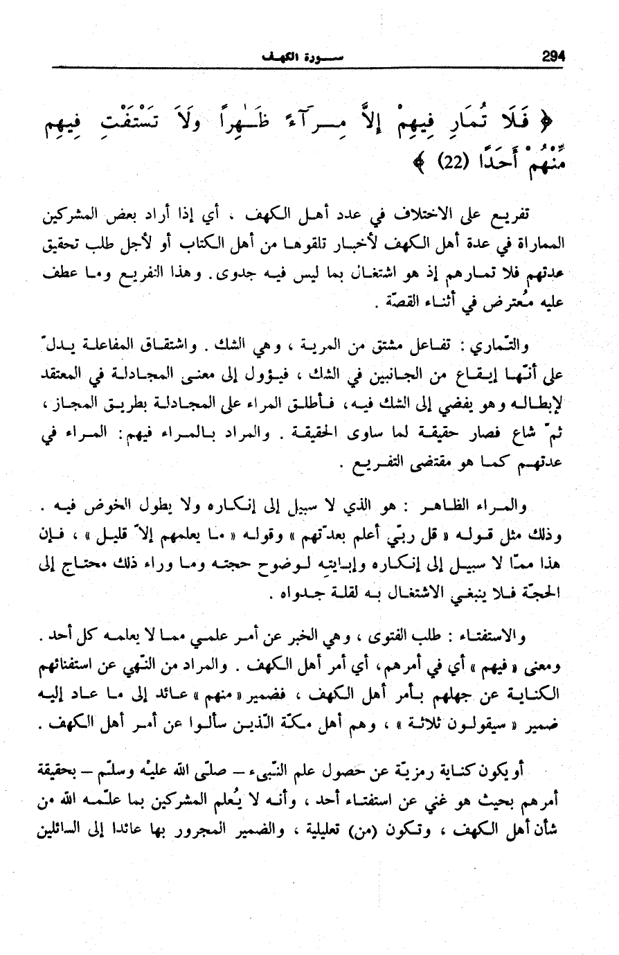 فَلا تُمارِ فِيهِمْ إِلَّا مِراءً ظاهِراً وَلا تَسْتَفْتِ فِيهِمْ مِنْهُمْ أَحَداً تَفْرِيعٌ عَلَى الِاخْتِلَافِ فِي عَدَدِ أَهْلِ الْكَهْف، أَي إِذْ أَرَادَ بَعْضُ الْمُشْرِكِينَ الْمُمَارَاةَ فِي عِدَّةِ أَهْلِ الْكَهْفِ لِأَخْبَارٍ تَلَقَّوْهَا مِنْ أَهْلِ الْكِتَابِ أَوْ لِأَجْلِ طَلَبِ تَحْقِيقِ عِدَّتِهِمْ فَلَا تُمَارِهِمْ إِذْ هُوَ اشْتِغَالٌ بِمَا لَيْسَ فِيهِ جَدْوَى. وَهَذَا التَّفْرِيعُ وَمَا عُطِفَ عَلَيْهِ مُعْتَرِضٌ فِي أَثْنَاءِ الْقِصَّةِ.