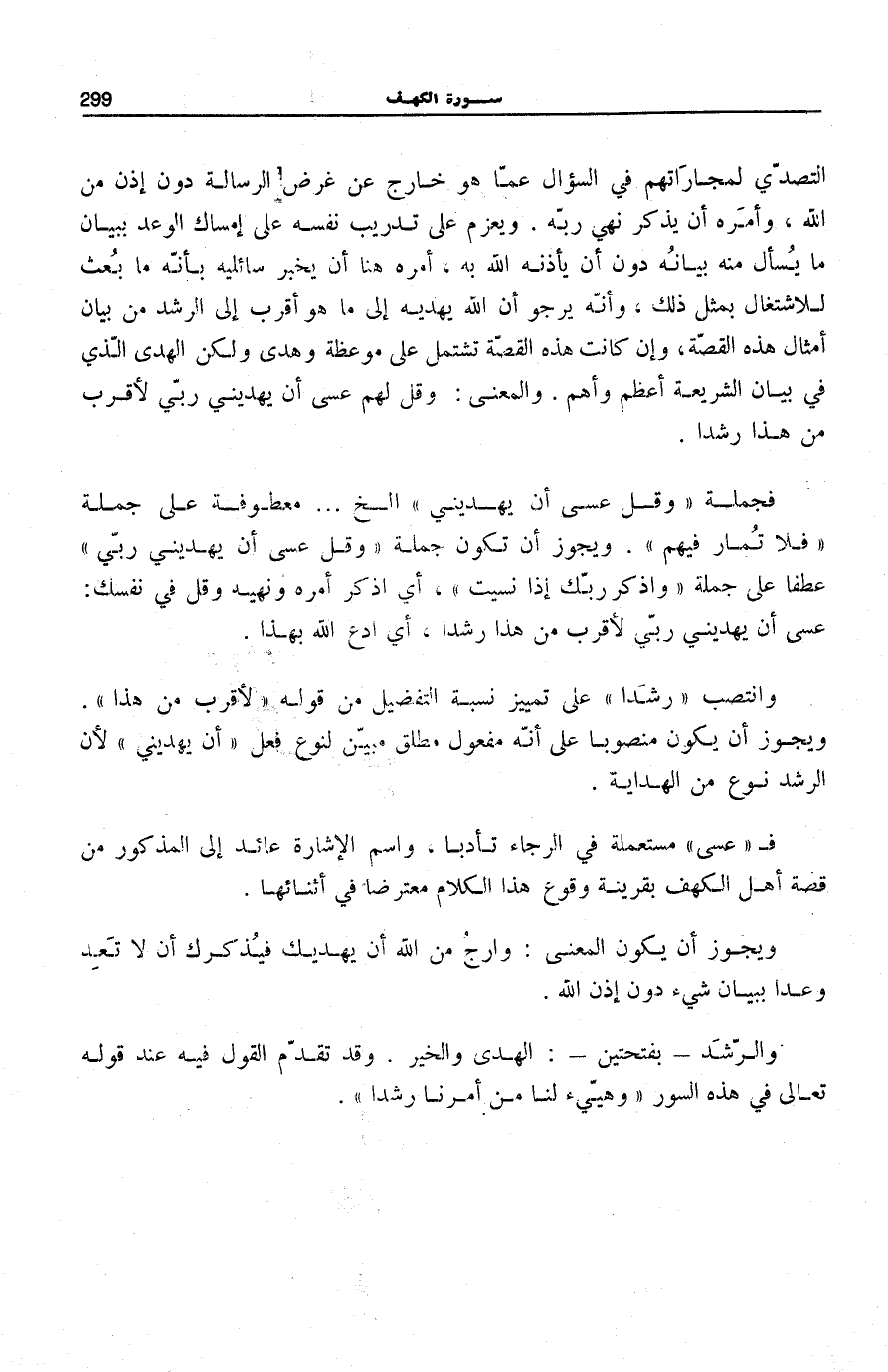 التَّصَدِّي لِمُجَارَاتِهِمْ فِي السُّؤَالِ عَمَّا هُوَ خَارِجٌ عَنْ غَرَضِ الرِّسَالَةِ دُونَ إِذْنٍ مِنَ اللَّهِ، وَأَمَرَهُ أَنْ يَذْكُرَ نَهْيَ رَبِّهِ. وَيَعْزِمَ عَلَى تَدْرِيبِ نَفْسِهِ عَلَى إِمْسَاكِ الْوَعْدِ بِبَيَانِ مَا يُسْأَلُ مِنْهُ بَيَانُهُ دُونَ أَنْ يَأْذَنَهُ اللَّهُ بِهِ، أَمَرَهُ هُنَا أَنْ يُخْبِرَ سَائِلِيهِ بِأَنَّهُ مَا بُعِثَ لِلِاشْتِغَالِ بِمِثْلِ ذَلِكَ، وَأَنَّهُ يَرْجُو أَنَّ اللَّهَ يَهْدِيهِ إِلَى مَا هُوَ أَقْرَبُ إِلَى الرُّشْدِ مِنْ بَيَانِ أَمْثَالِ هَذِهِ الْقِصَّةِ، وَإِنْ كَانَتْ هَذِهِ الْقِصَّةُ تَشْتَمِلُ عَلَى مَوْعِظَةٍ وَهُدًى وَلَكِنَّ الْهُدَى الَّذِي فِي بَيَانُ الشَّرِيعَةِ أَعْظَمُ وَأَهَمُّ. وَالْمَعْنَى: وَقُلْ لَهُمْ عَسَى أَنْ يَهْدِيَنِي رَبِّي لِأَقْرَبَ مِنْ هَذَا رَشَدًا.