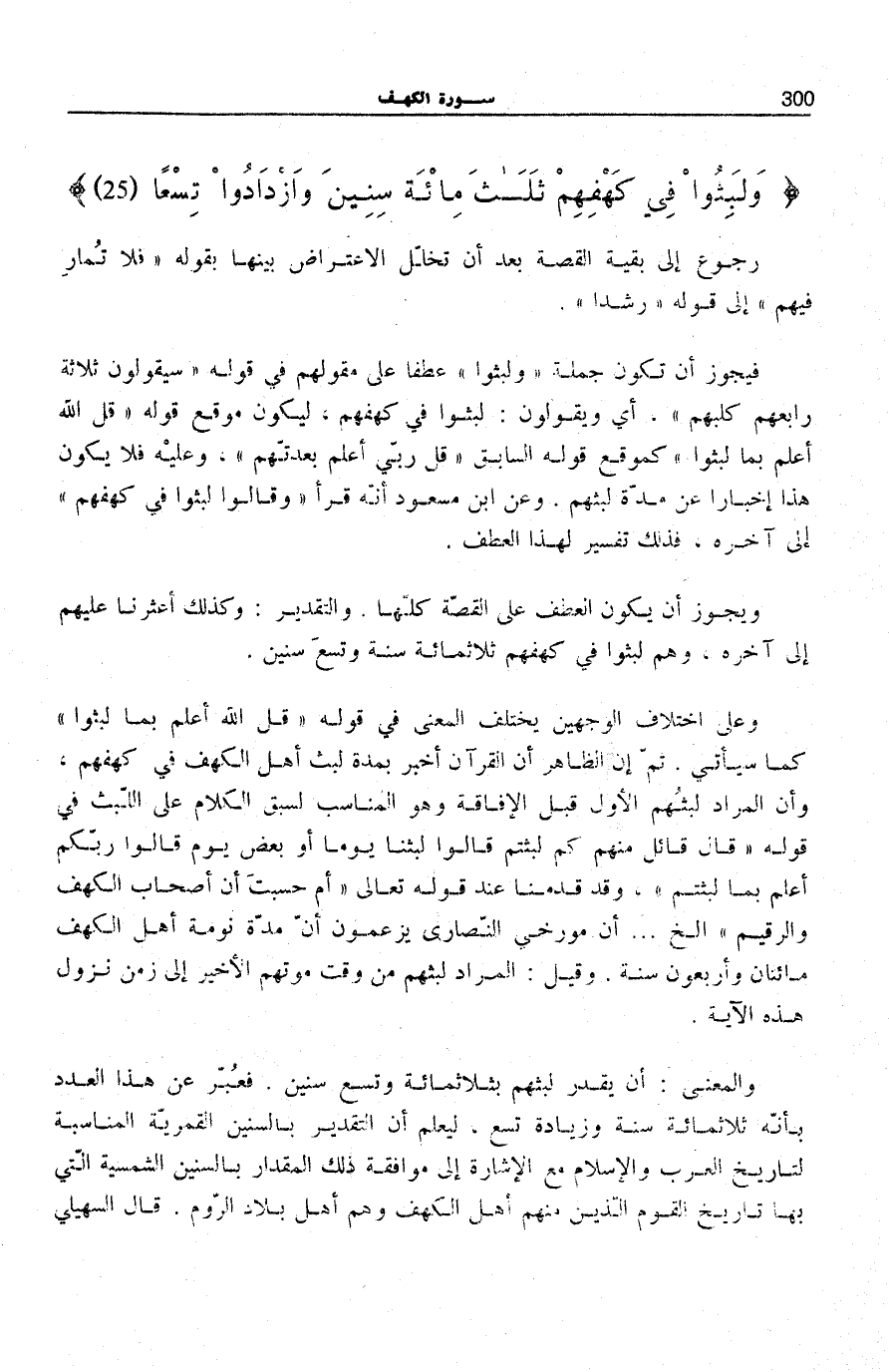 وَالْمَعْنَى: أَنْ يُقَدَّرَ لُبْثُهُمْ بِثَلَاثِمِائَةٍ وَتِسْعِ سِنِينَ. فَعَبَّرَ عَنْ هَذَا الْعَدَدِ بِأَنَّهُ ثَلَاثُمِائَةِ سَنَةٍ وَزِيَادَةُ تِسْعٍ، لِيُعْلَمَ أَنَّ التَّقْدِيرَ بِالسِّنِينَ الْقَمَرِيَّةِ الْمُنَاسِبَةِ لِتَارِيخِ الْعَرَبِ وَالْإِسْلَامِ مَعَ الْإِشَارَةِ إِلَى مُوَافَقَةِ ذَلِكَ الْمِقْدَارِ بِالسِّنِينَ الشَّمْسِيَّةِ الَّتِي بِهَا تَارِيخُ الْقَوْمِ الَّذِينَ مِنْهُمْ أَهْلُ الْكَهْفِ وَهُمْ أَهْلُ بِلَادِ الرُّومِ. قَالَ السُّهَيْلِيُّ