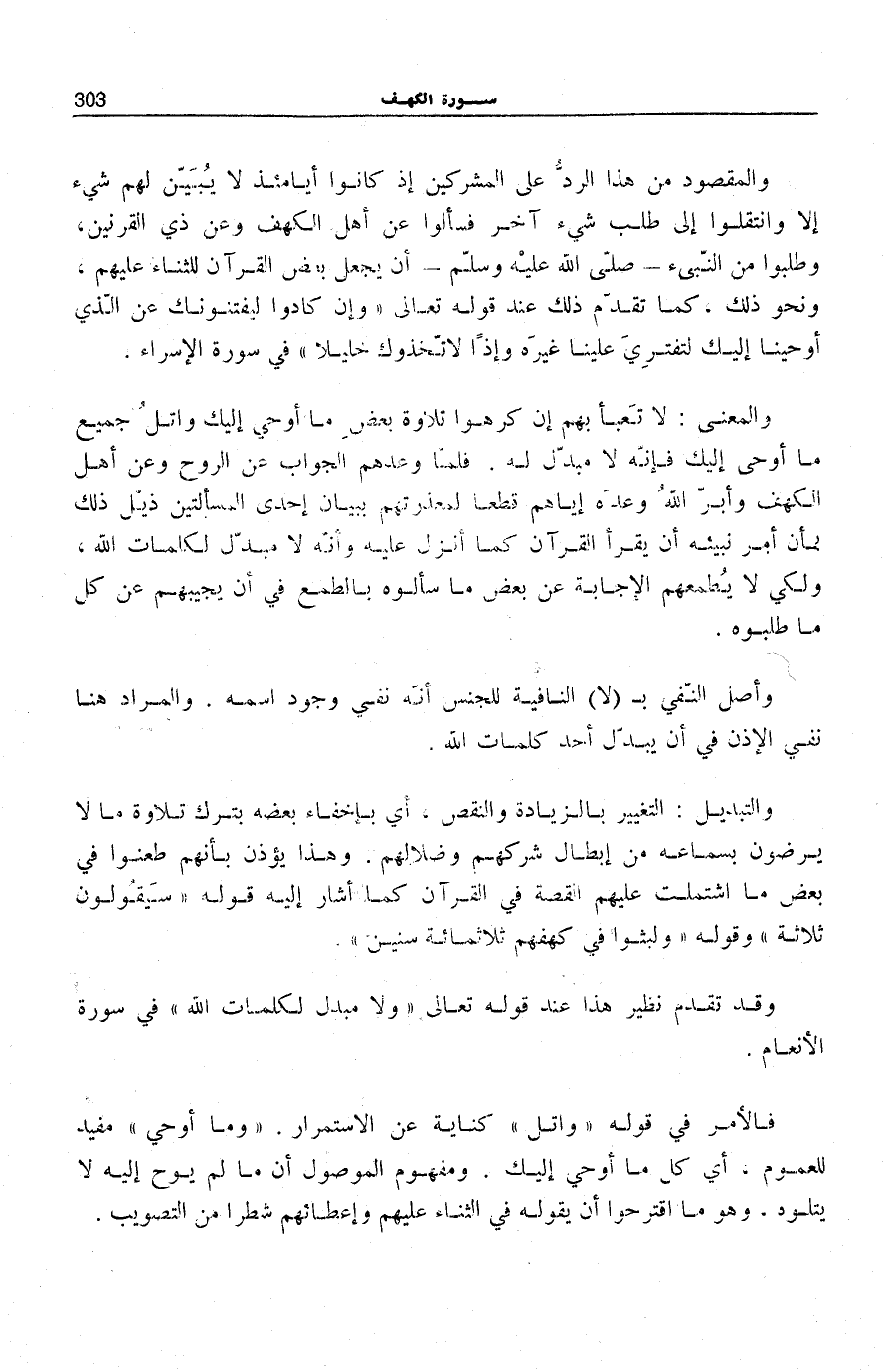 وَالْمَعْنَى: لَا تَعْبَأْ بِهِمْ إِنْ كَرِهُوا تِلَاوَةَ بَعْضِ مَا أُوحِيَ إِلَيْكَ وَاتْلُ جَمِيعَ مَا أُوحِي إِلَيْكَ فَإِنَّهُ لَا مُبَدِّلَ لَهُ. فَلَمَّا وَعَدَهُمُ الْجَوَابَ عَنِ الرُّوحِ وَعَنْ أَهْلِ الْكَهْفِ وَأَبَرَّ اللَّهُ وَعْدَهُ إِيَّاهُمْ قَطْعًا لِمَعْذِرَتِهِمْ بِبَيَانِ إِحْدَى الْمَسْأَلَتَيْنِ ذَيَّلَ ذَلِكَ بِأَن أَمر نبيئه أَنْ يَقْرَأَ الْقُرْآنَ كَمَا أُنْزِلَ عَلَيْهِ وَأَنَّهُ لَا مُبَدِّلَ لِكَلِمَاتِ اللَّهِ، وَلِكَيْ لَا يُطْمِعَهُمُ الْإِجَابَةُ عَنْ بَعْضِ مَا سَأَلُوهُ بِالطَّمَعِ فِي أَنْ يُجِيبَهُمْ عَنْ كُلِّ مَا طَلَبُوهُ.