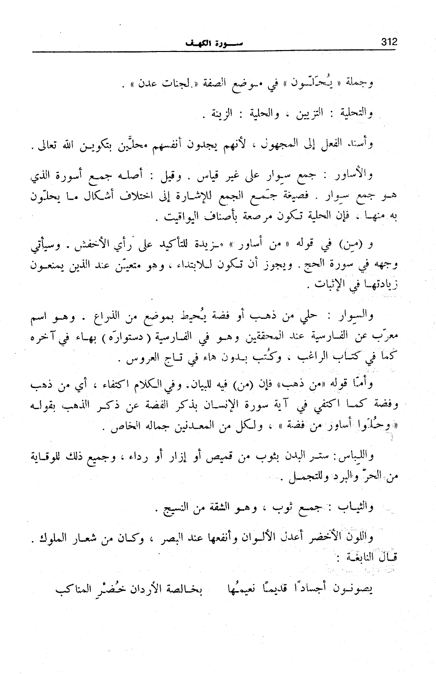 وَأَمَّا قَوْلُهُ: مِنْ ذَهَبٍ فَإِنَّ (مِنْ) فِيهِ لِلْبَيَانِ، وَفِي الْكَلَامِ اكْتِفَاءٌ، أَيْ مِنْ ذَهَبٍ وَفِضَّةٍ كَمَا اكْتَفَى فِي آيَةِ سُورَةِ الْإِنْسَانِ بِذِكْرِ الْفِضَّةِ عَنْ ذِكْرِ الذَّهَبِ بِقَوْلِهِ: وَحُلُّوا أَساوِرَ